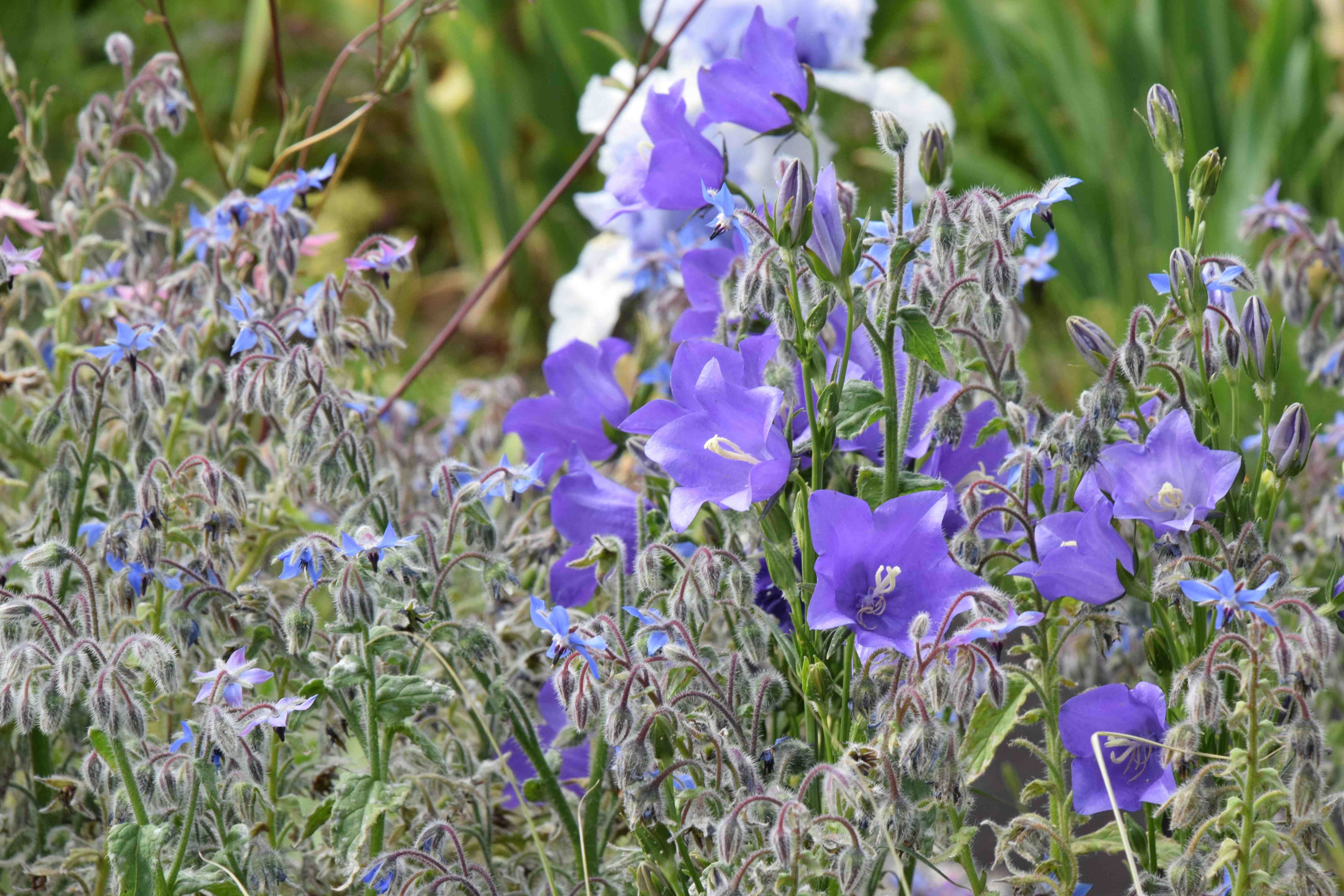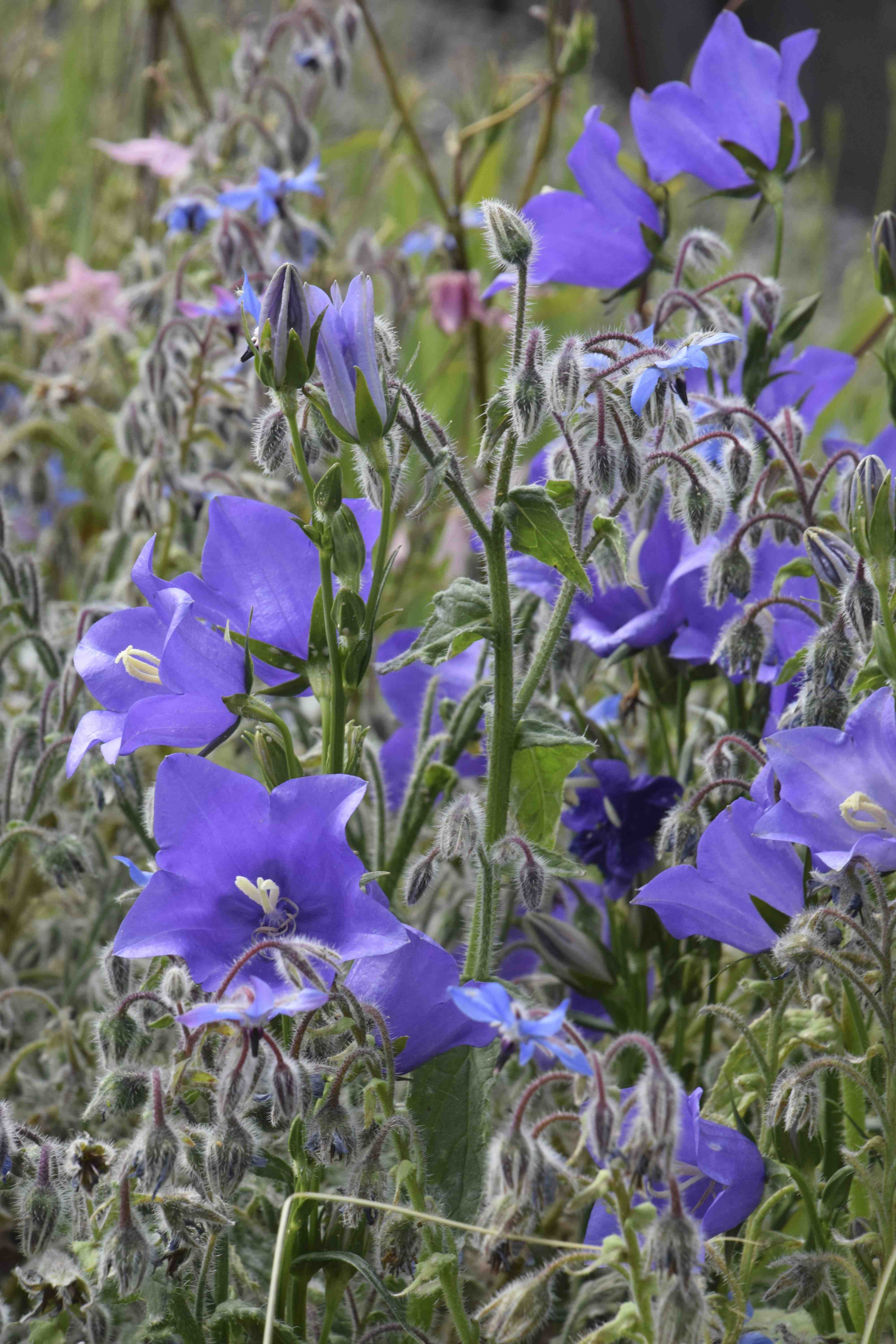 Being so tall and slender this campanula gives height and elegance but it can be felled by strong winds. I have it growing through spreading borage which holds up the campanulas but does bring with it an issue! What colour are these flowers? Blue? Well I would have said so until you compare them to the blooms of the borage. Suddenly they appear more on the purple side of blue. Does it matter? Not one jot!
