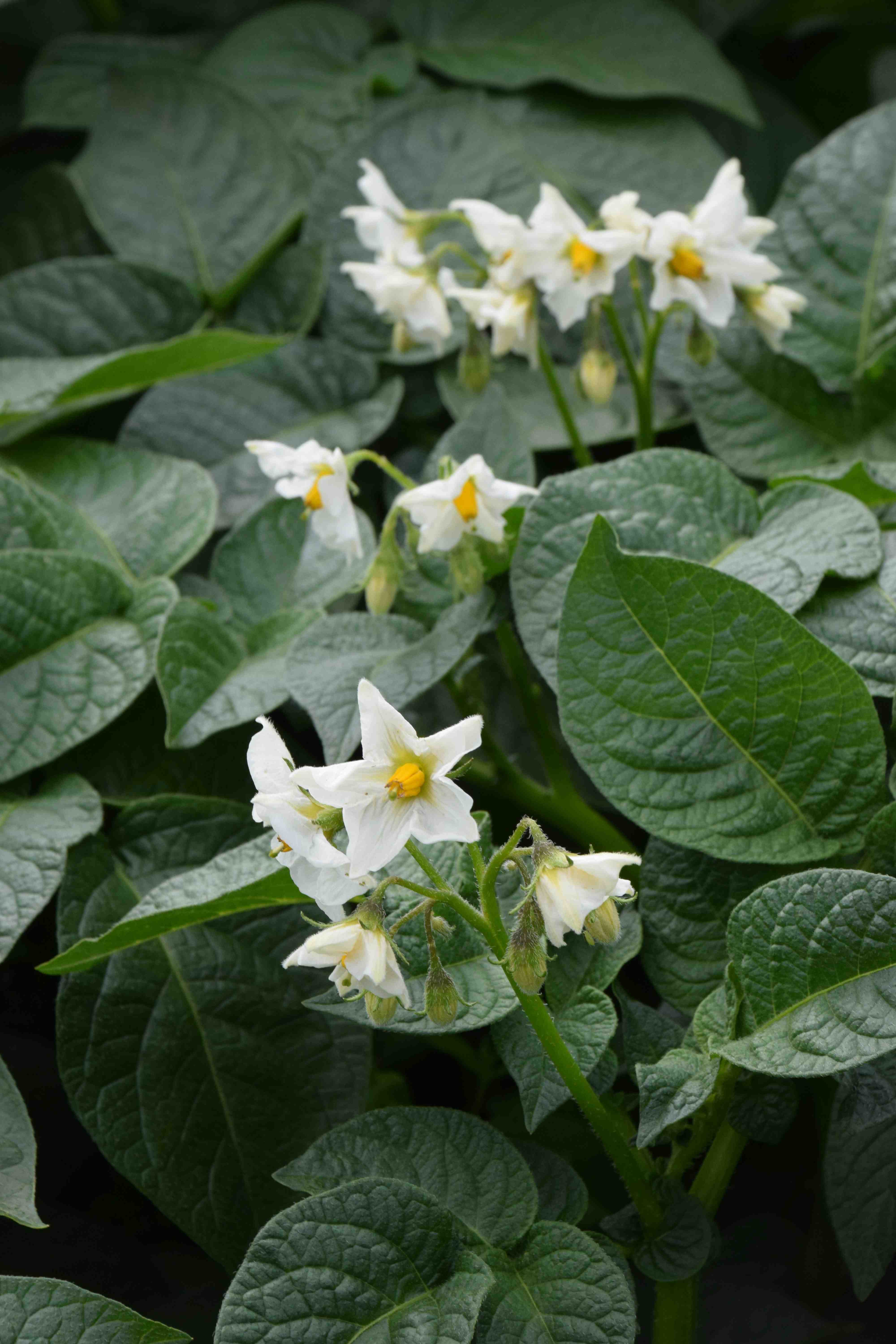 The flowers of the early ‘Colleen’ are smaller and rather dull but they are a sign that the plants will be ready to lift soon so we may have a crop soon.