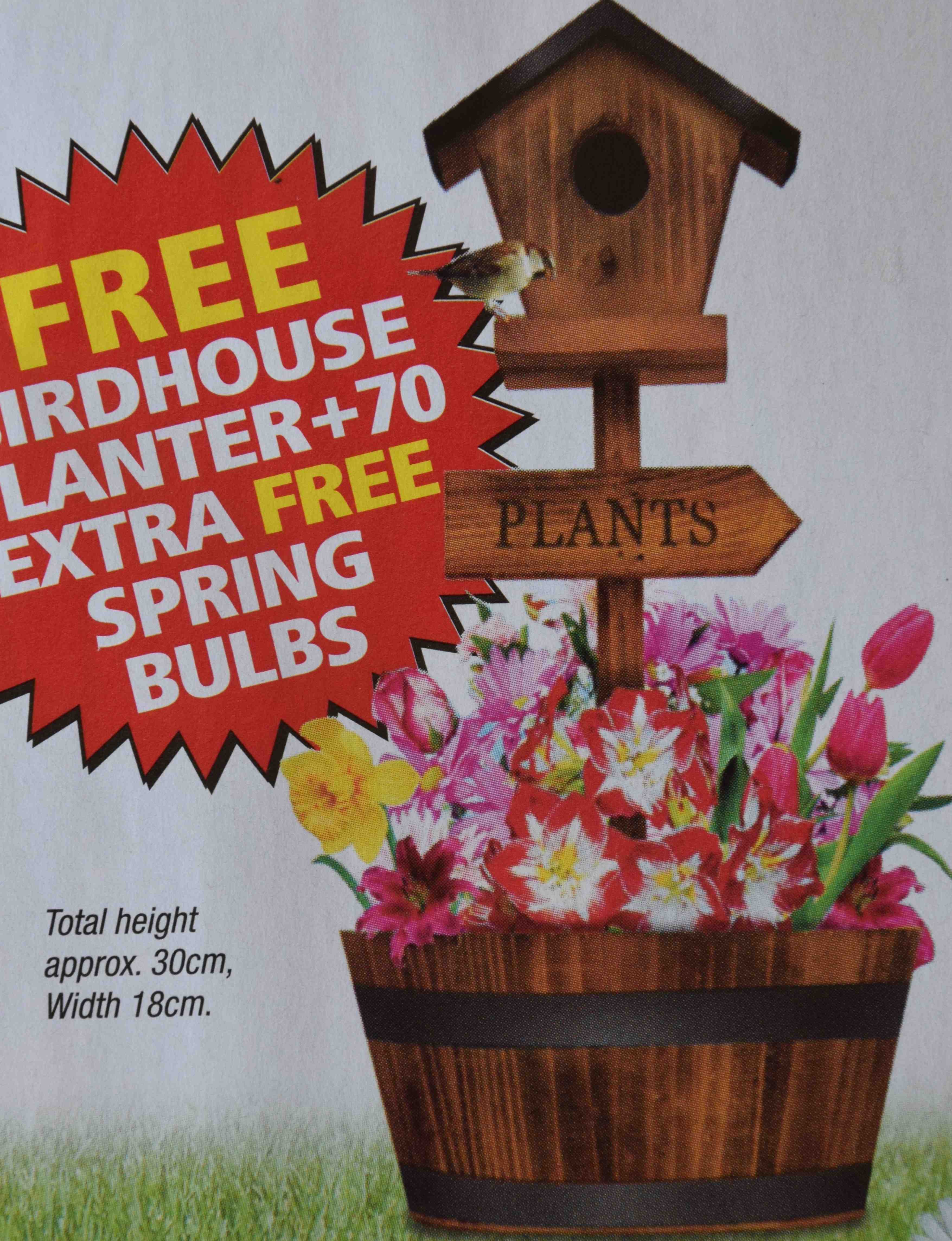 What really gets my goat is that birdhouse planter. What a great offer – you get that great planter and bird house free when you buy just 8 tulip bulbs for £15.28 (yes there is postage on top). You get extra free bulbs – this is only a guess but I would suspect that the majority of them are anemone, allium moly or muscari – could be wrong but I won’t be ordering to find out.