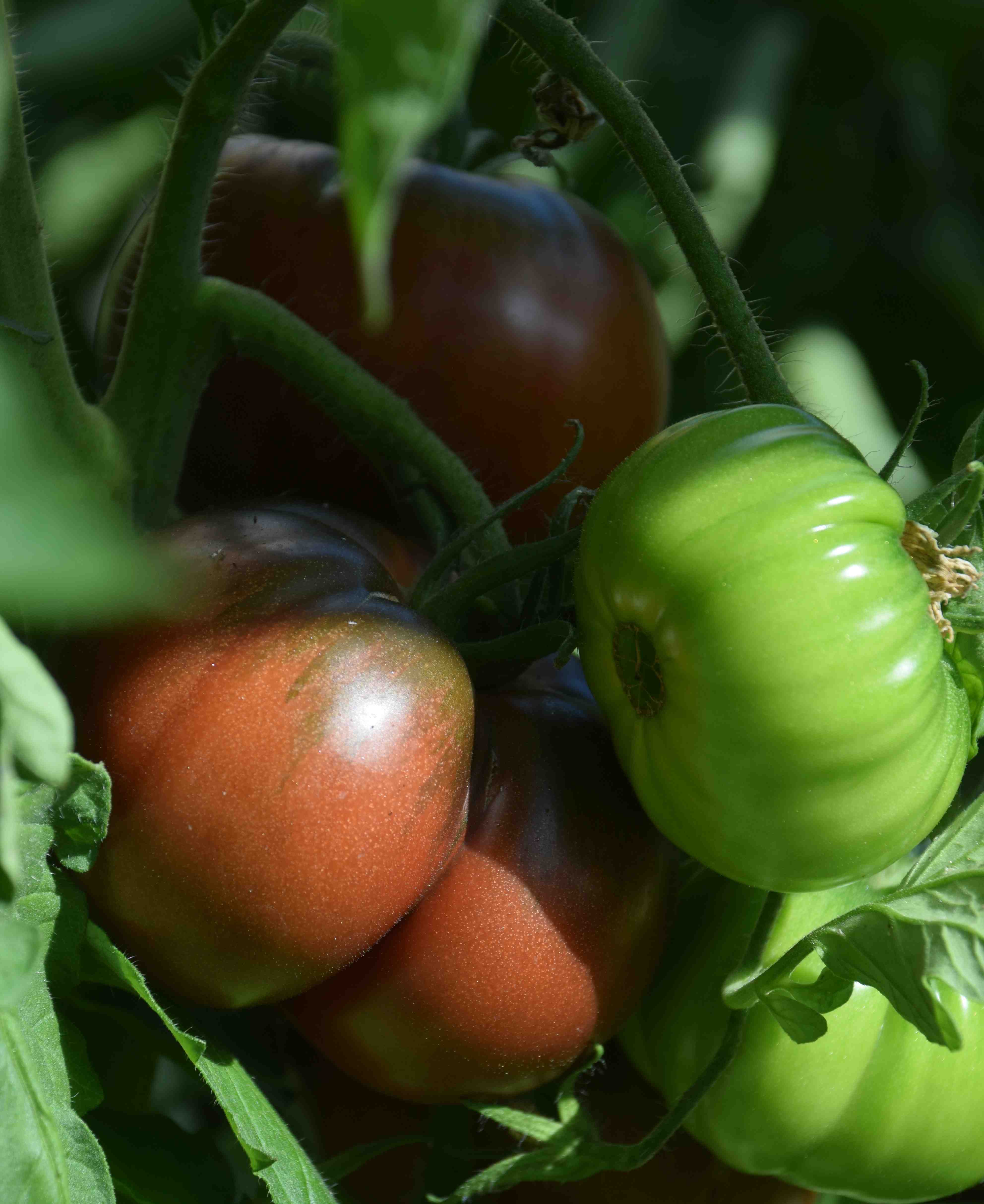 A collection of ‘black’ ish toms including big ‘Black Russian’, ‘Black Vernissage’ (with stripes) and ‘Rosella’