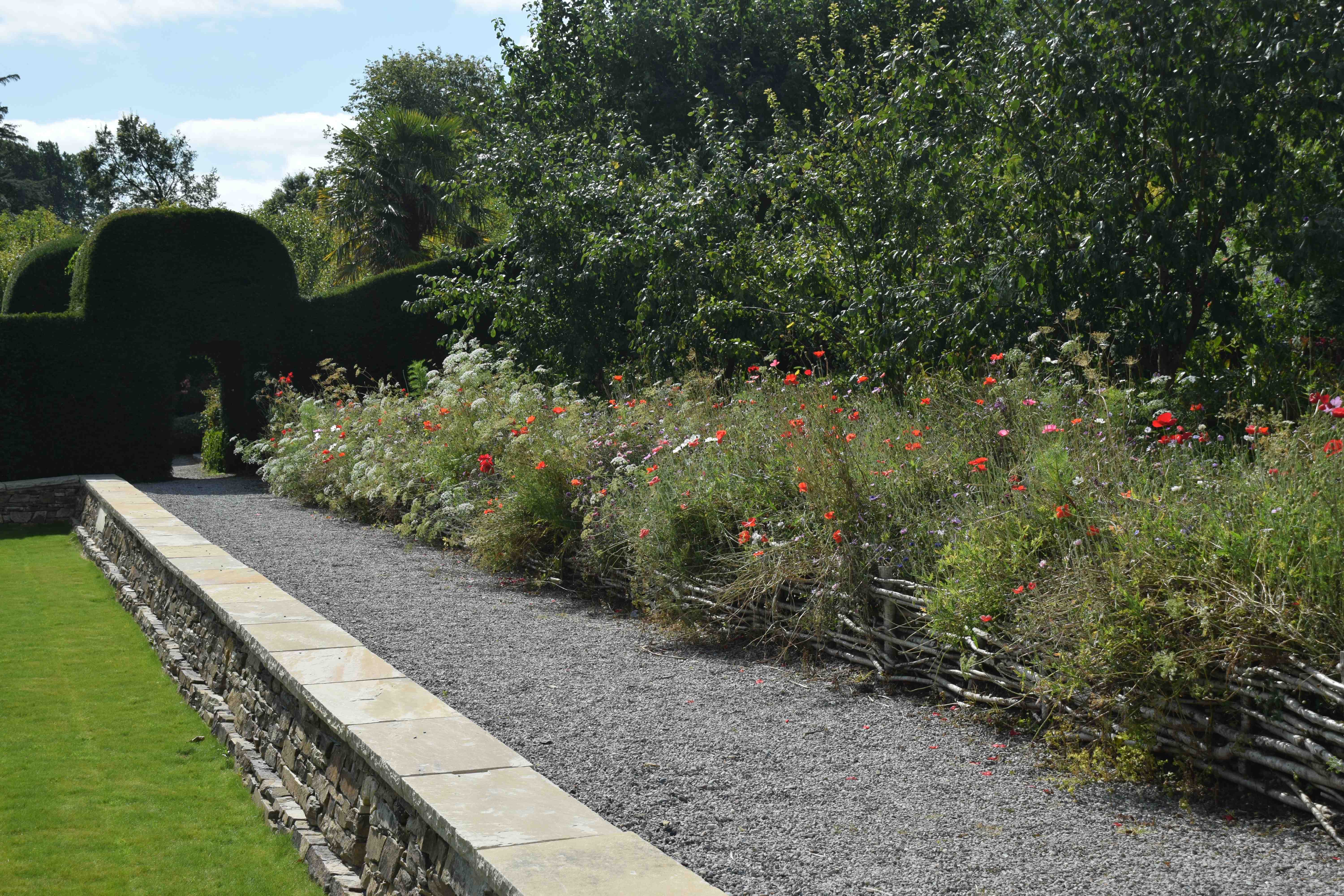 The wave of colour was held back by willow hurdles and wands bent over to make hoops so the grass paths could be mown.