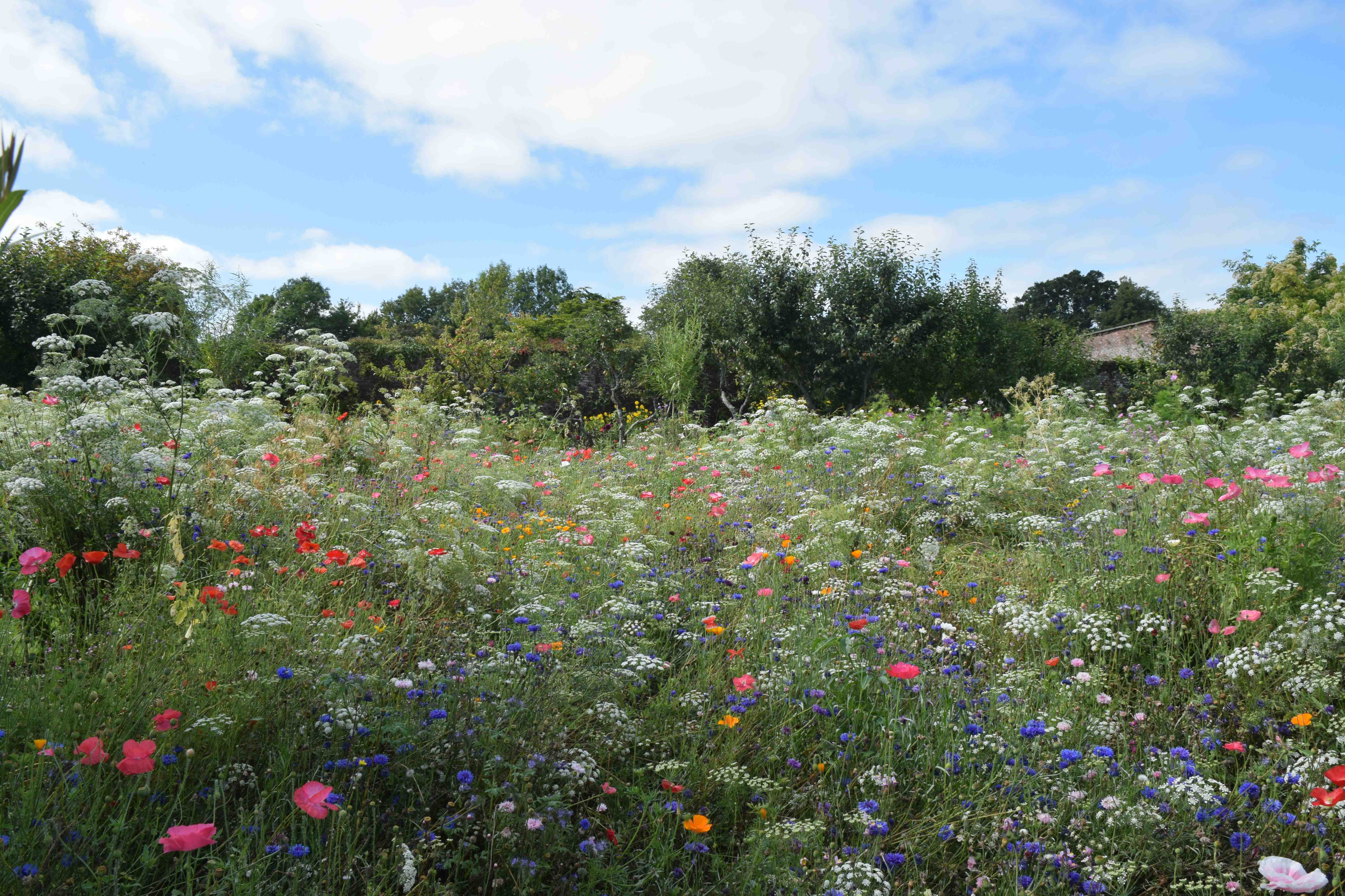 Frothy clouds of white ammi (probably Ammi majus) were coloured with pastel corn poppies, blue cornflowers with flashes of orange Californian poppies.
