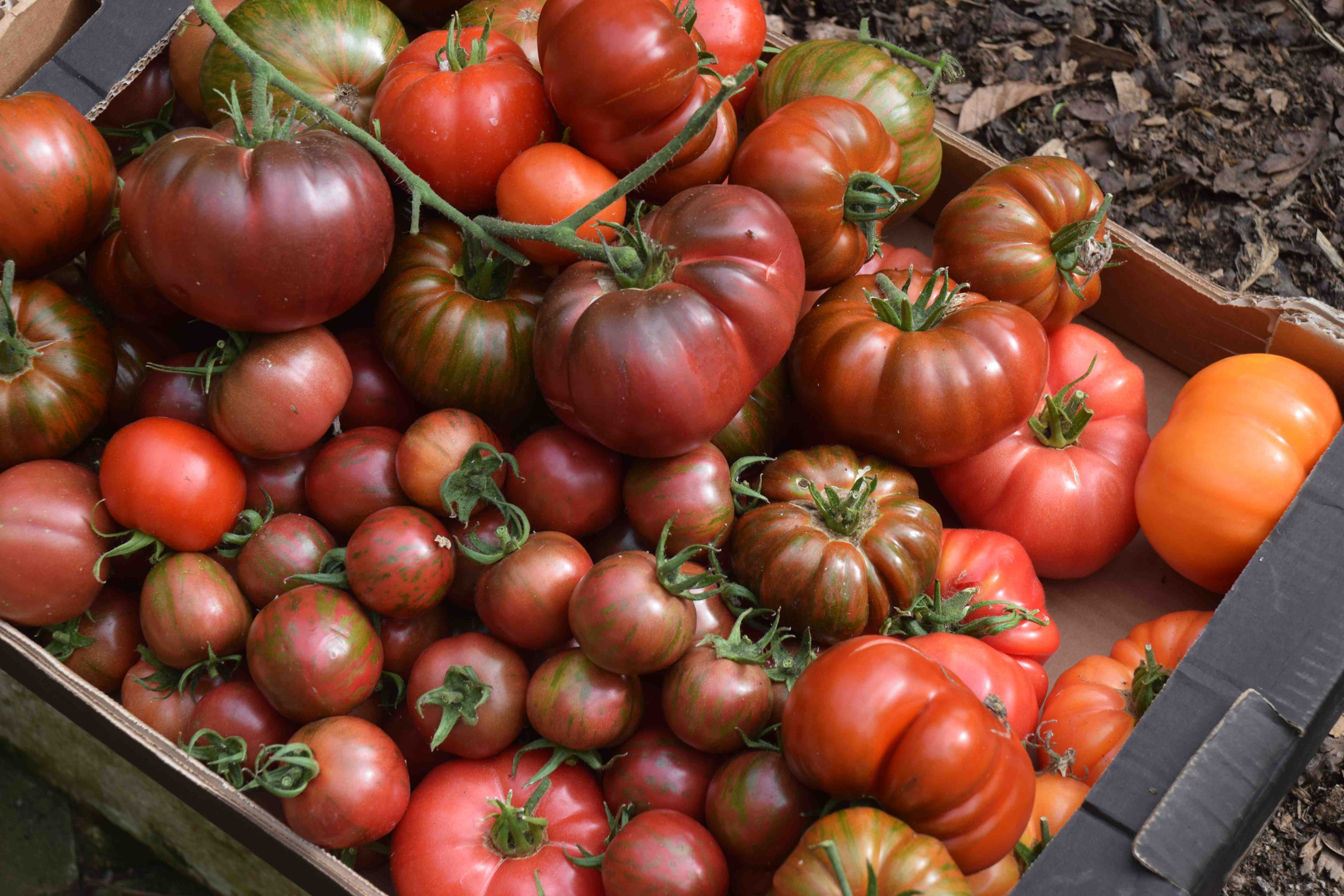 A box of darker toms including big ‘Vintage Wine’, small, stripey ‘Black Vernisage’ and ‘Black Russian’