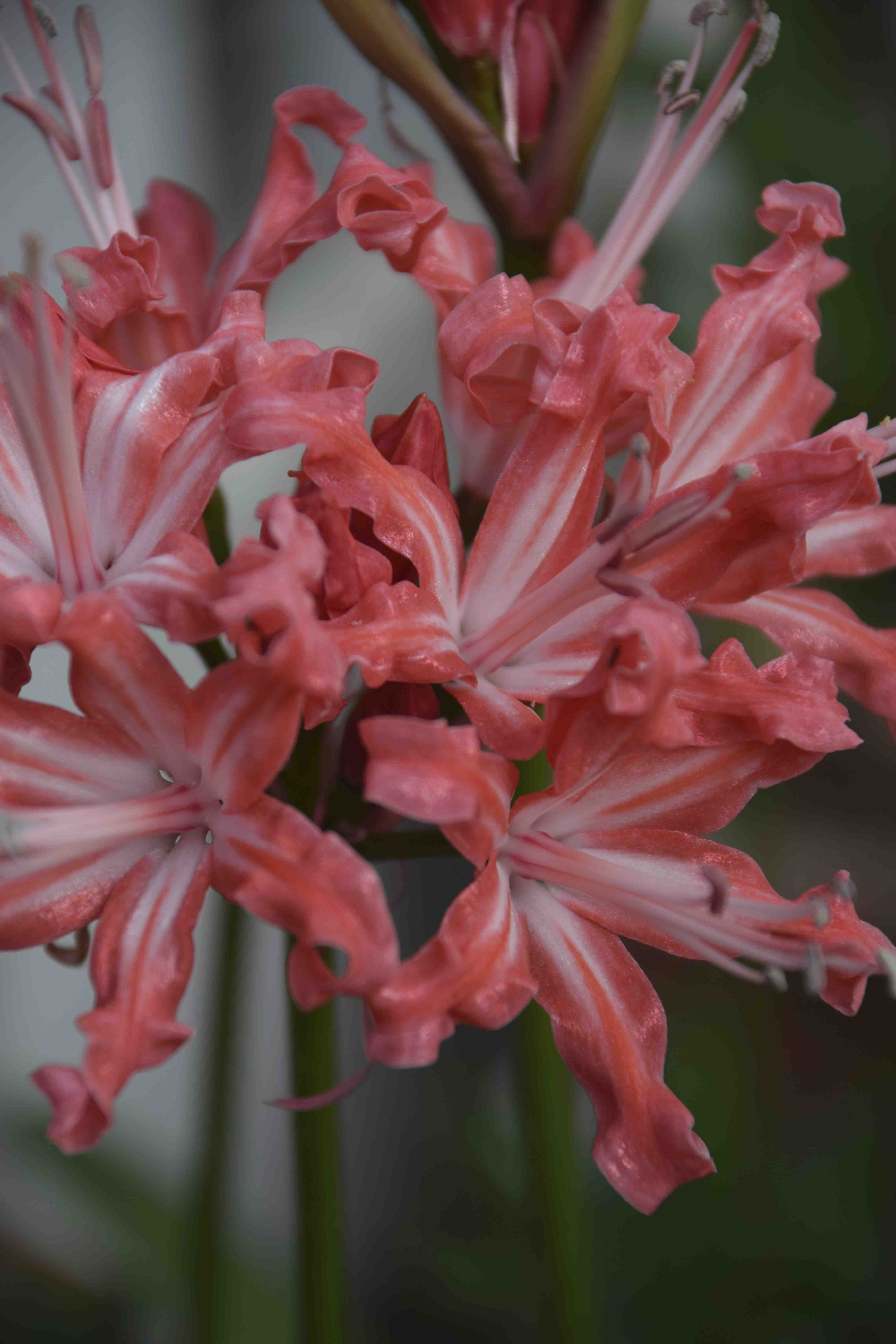 The owner of these nerines keeps them in a sunny greenhouse most of the year. It is unheated but the plot is not far from the sea and winters are usually mild here – at home in the UK I would give them frost protection. They come into leaf soon after flowering and are dormant in summer. Apparently they are best grown in plastic pots but the owner of these prefers terracotta pots and I must say I would go with that too to avoid overwatering. He uses a loam-based potting mix with added grit but also some well rotted manure so they get a fairly rich diet and appear to be thriving on it.