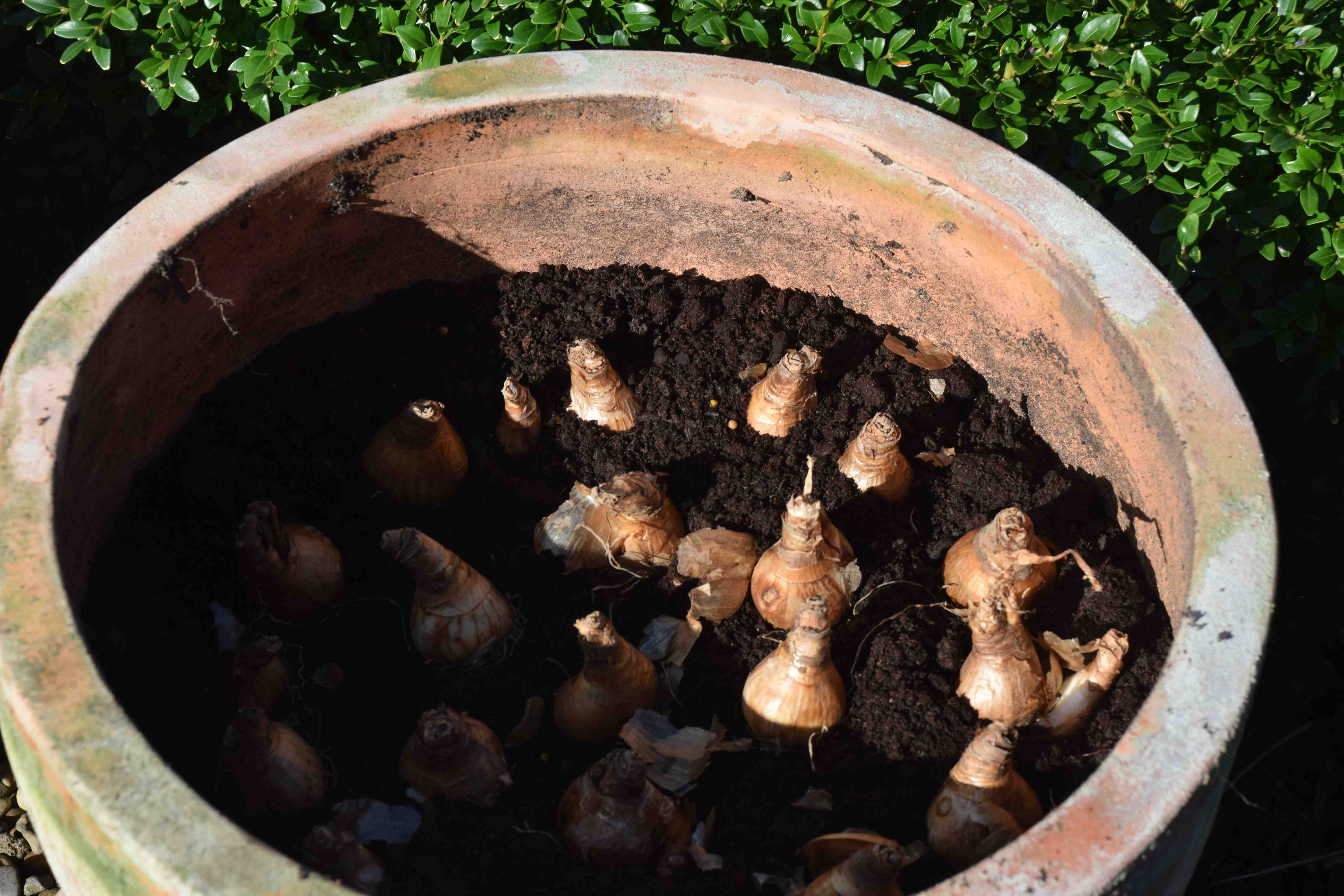 I have been planting bulbs in grass and in the border for a week now but yesterday got round to planting the first few pots. I want to plant all the pots soon but the summer plants are still doing so well I am holding off changing things until we get the first frost – at least for a few weeks. The small bulbs and daffodils should be planted by the end of the month really and I do not want to compromise the spring display too much but a few weeks won’t make too much difference really and the summer plants are still looking good as I write.