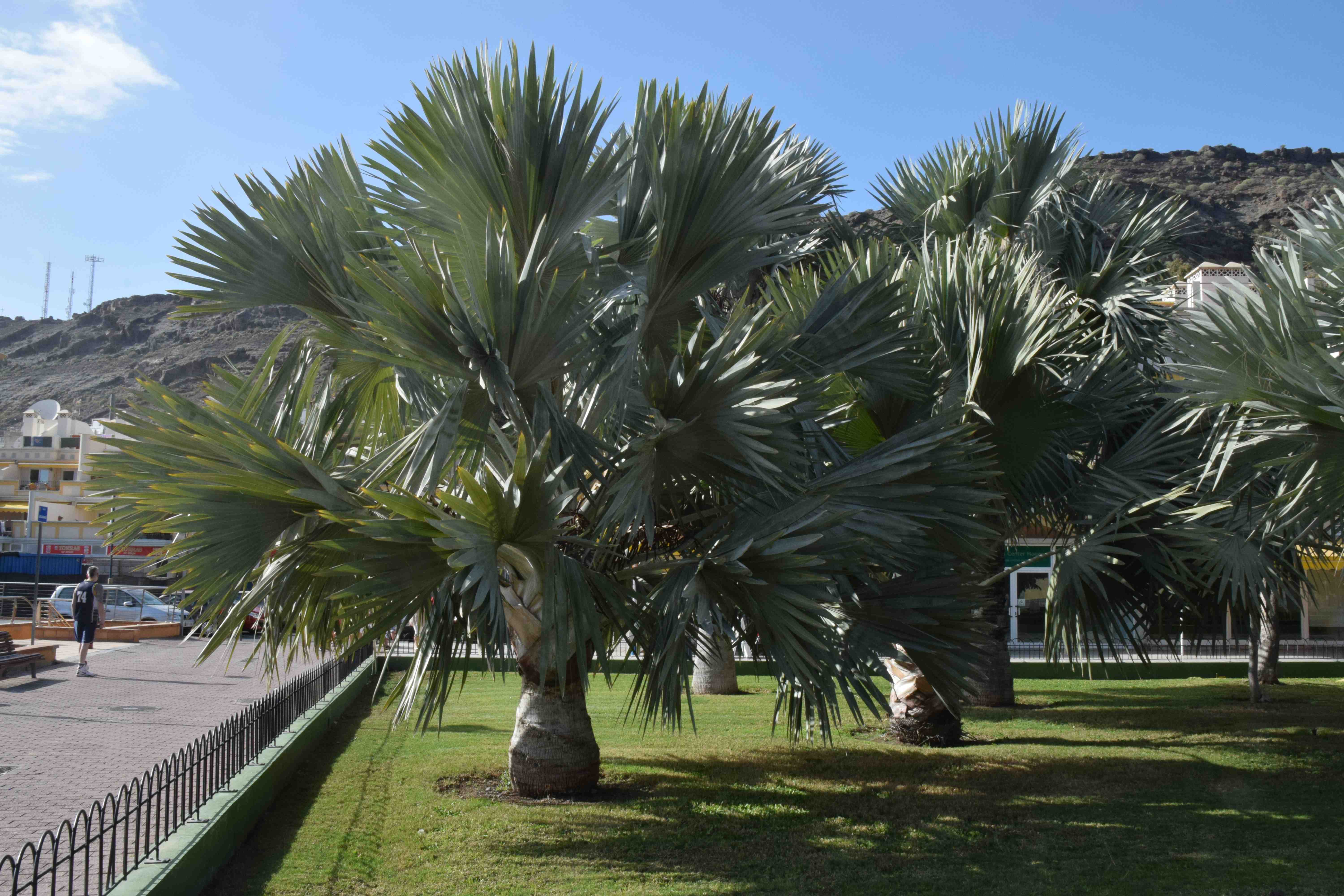 Today, another palm from Madagascar, and a very distinctive one; so much so that I am confident that I have identified it correctly! It is a large fan palm with huge leaves in a beautiful silvery blue. It is named after Otto von Bismarck and the name ‘nobilis’ means noble, which is appropriate. It is one of the commonest palms in Madagascar, in the north and west and grows in a wide variety of habitats, often in dry places which may explain why it has done so well in cultivation. Although it grows best in tropical climates it will tolerate Meditteranean climates and will survive light frosts, although that will slow growth.In hot climates this is a fast growing palm that can produce up to two leaves per month. The magnificent leaves are fanshaped with some spines on the petiole and can be 3m in diameter, covered in white wax and some scales.