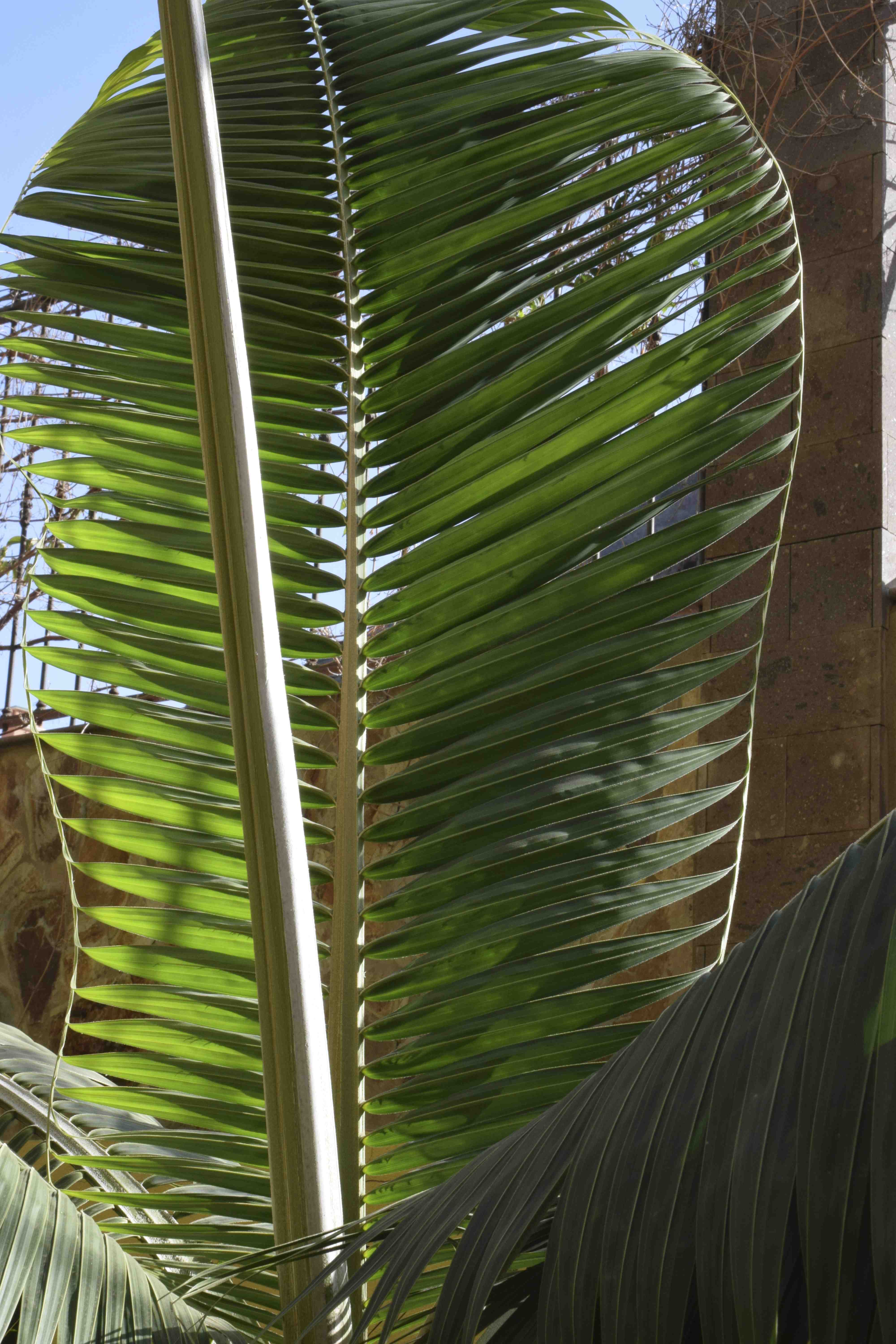 Commonly called the hurricane palm, Dictyosperma album is a fast growing palm from Mauritius and nearby islands. It is a feather palm and the reason I took photographs was the beautiful way the young leaves opened, with the ends of the leaflets joined by their contiguous tips, creating a frame that highlighted their beauty. Although common in cultivation it is almost extinct in the wild. Like many palms, the base of the leaf encircles the trunk, forming a crownshaft. In this species the crownshaft is more than 1m long and leaves themselves can be 3m long.
