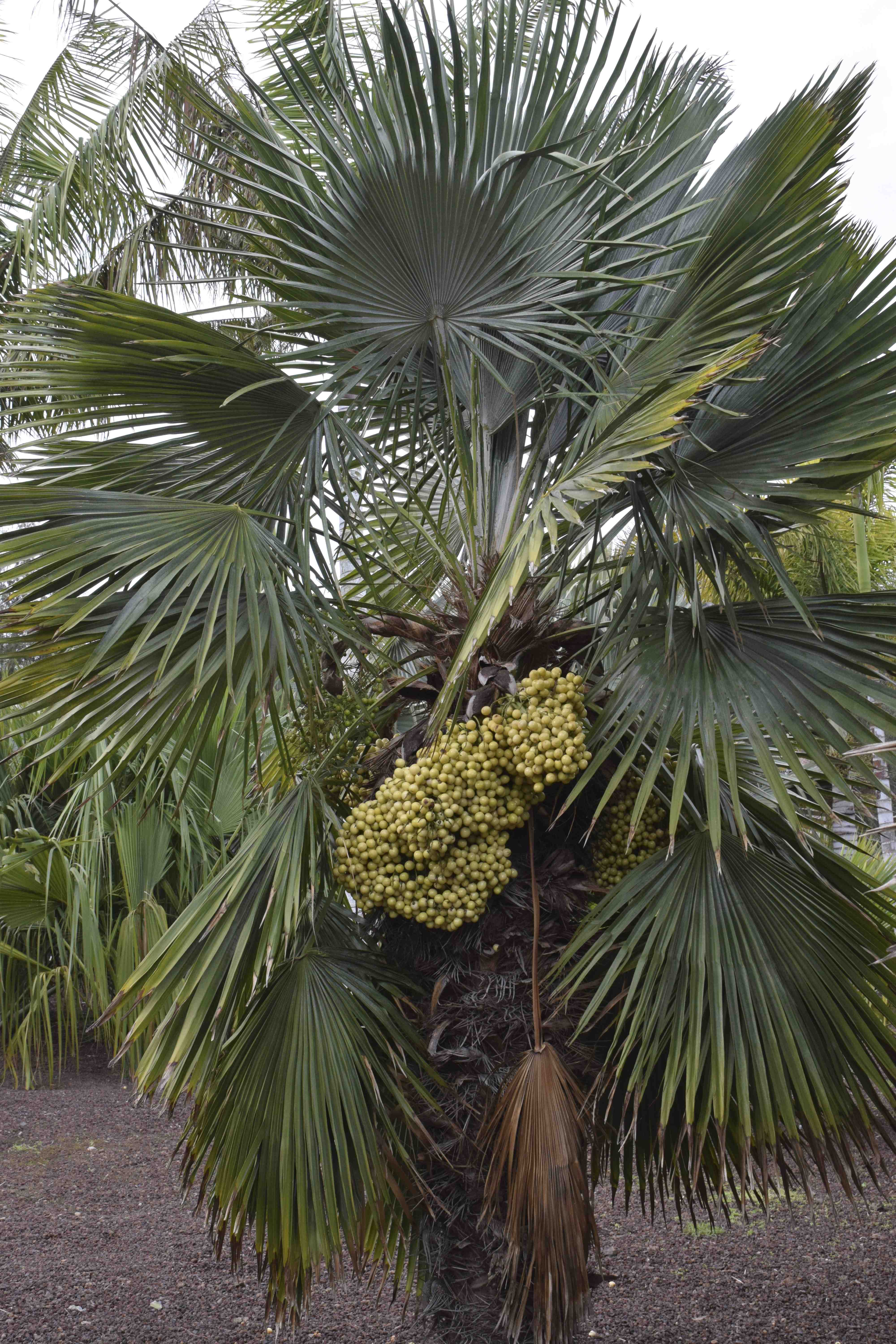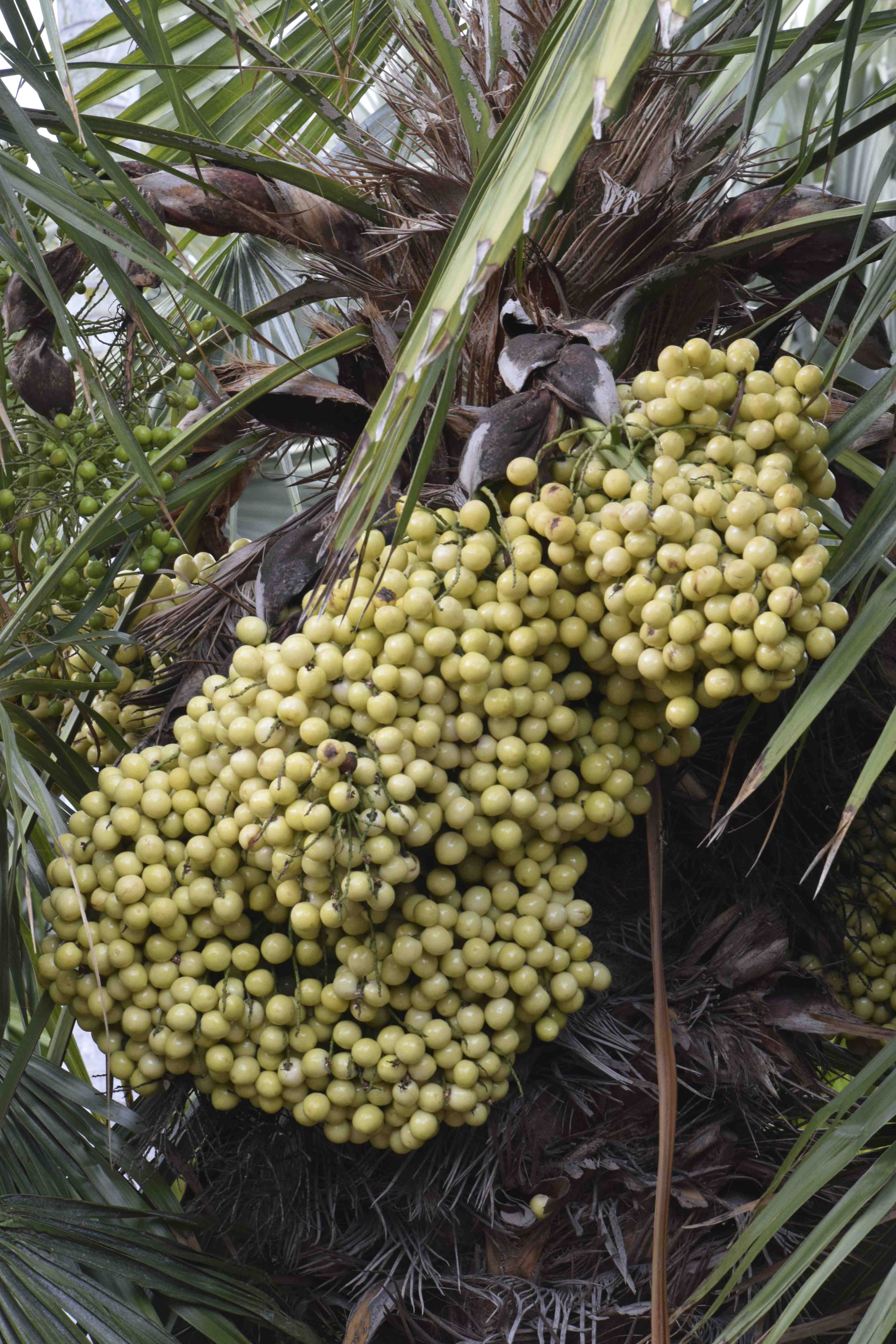 Trithrinax acanthocoma is one of the commonest species, from Brazil, and grows to about 4m high. Like others in the genus it is very resistant to drought and prefers sun and well drained soil. It is also tolerant of light frost but that is probably only in dry conditions and I do not think this means it will thrive in a UK climate. The leaf tips split into two to make a fork. The flower clusters develop into large, dense bunches of small, creamy white fruits.