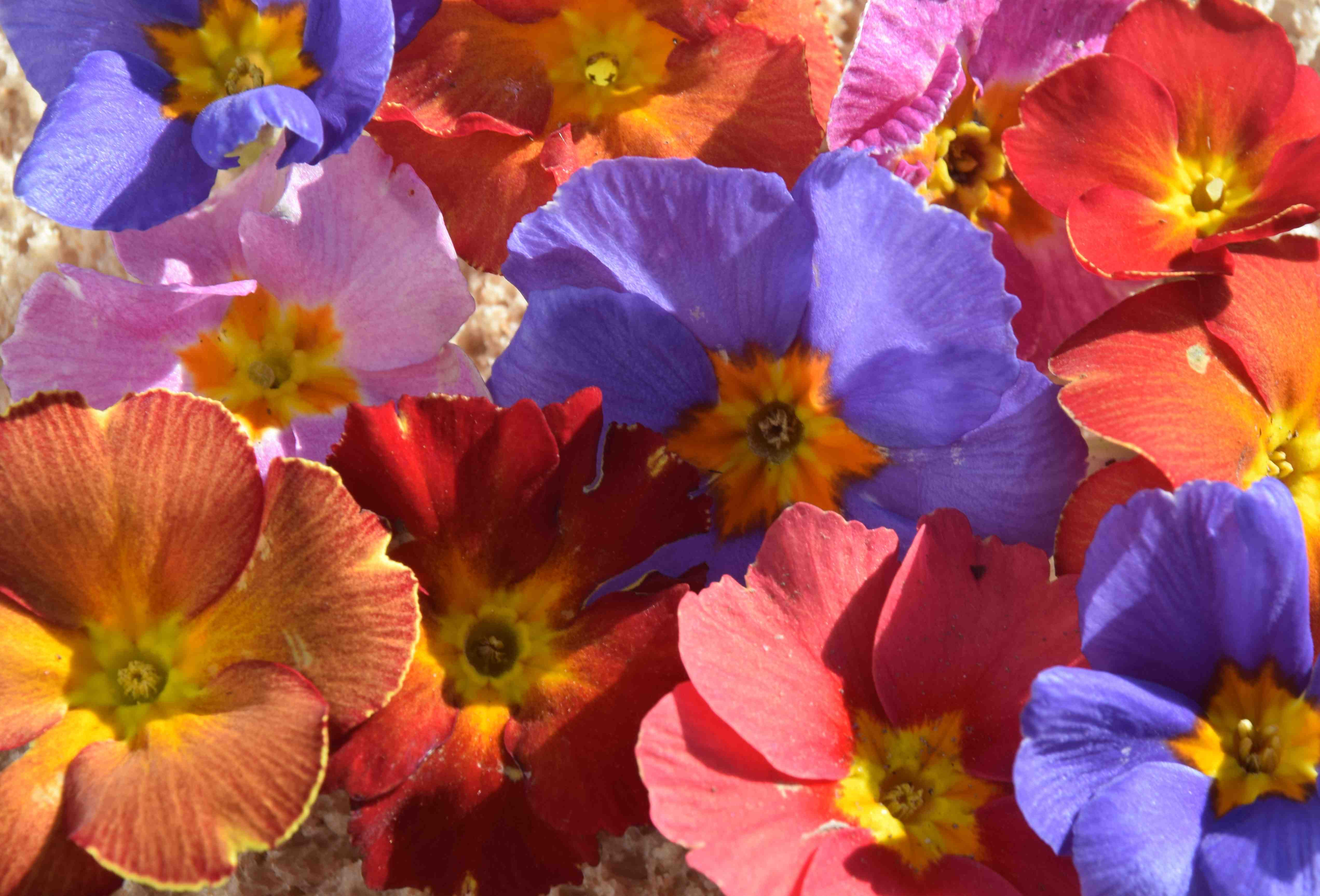 Lower down, just above the soil, the first of the Barnhaven polyanthus* have started to bloom. In fact there have been a few flowers for several weeks but there were enough to pick a selection yesterday. It is worth remembering that these plants are growing outside and just the day before were battered by rain and wind. Some plants have even lost leaves on the windward side because of the vicious winds. And yet the flowers stand up to the elements in a way that more modern and larger-flowered types could only dream of doing.