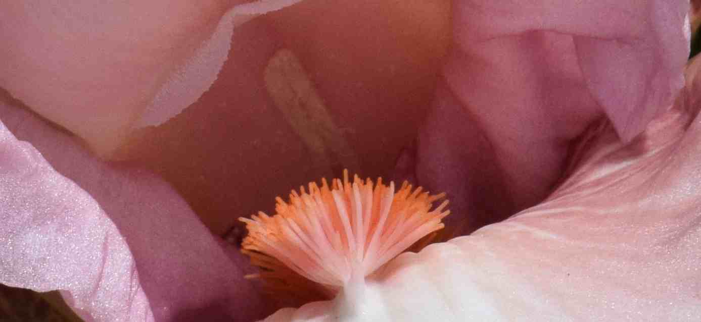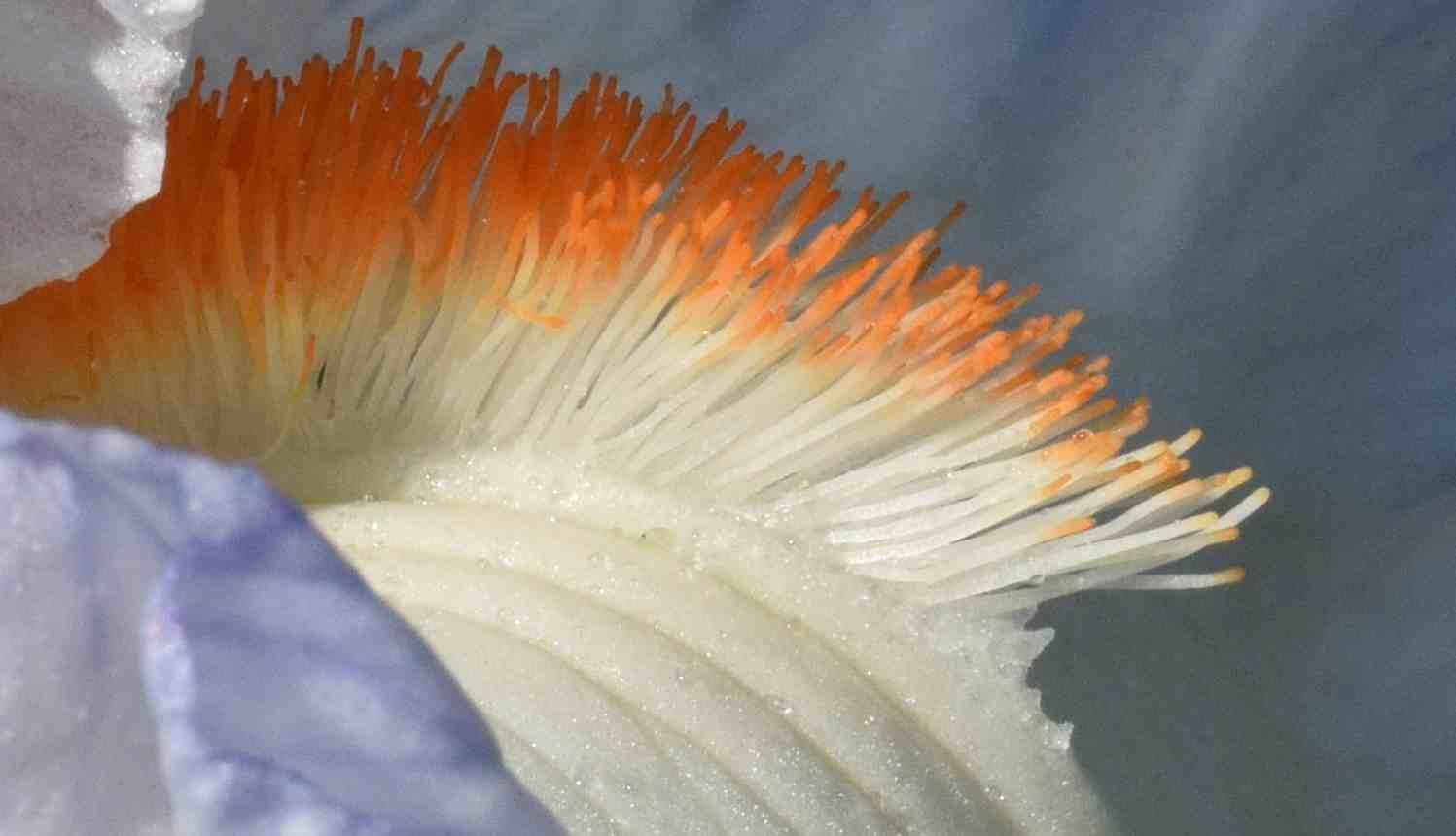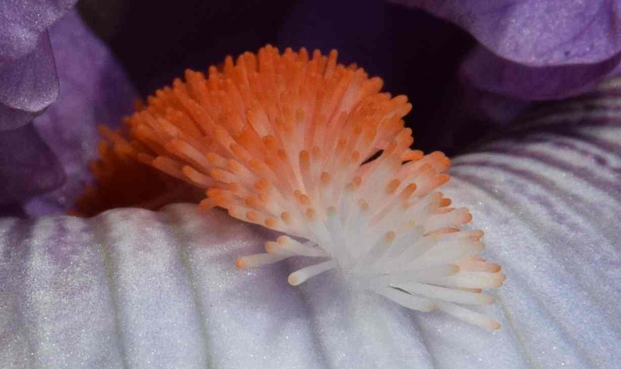 In the wild iris the beards are presumably used to steer the pollinating insects – bees – into the centre of the flower. Above the beard is the stylar arm with is a petaloid stigma arm with a stigmatic flap that receives the pollen from the back of the bee. As the bee crawls into the flower to get to the nectar the stamen brushes pollen on its back (and I guess the beard tickles its tummy). As the bee backs out the stigmatic flap is pushed shut to prevent the flower being self pollinated. As it crawls in the next flower the stigmatic flap is pushed open to receive the pollen. Hopefully you can see all this below.