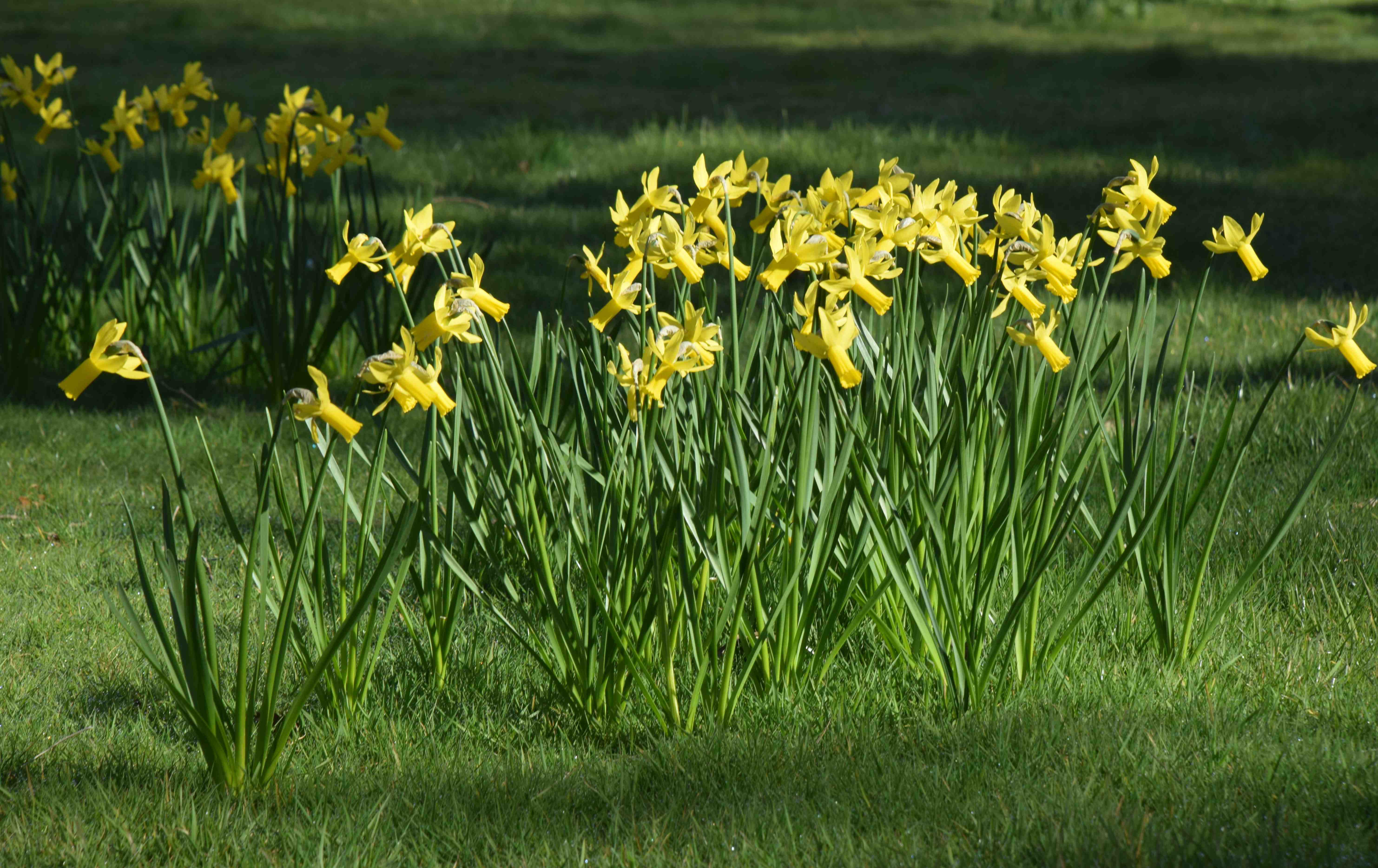 First is ‘Rapture’ an all yellow cyclamineus hybrid (6 Y-Y) from Grant Mitsch (USA) introduced in 1976. Cyclamineus daffodils all have those swept back petals and they are very perky in ‘Rapture’. The long, narrow trumpet is the same colour and very straight and slightly flared at the mouth. What is exceptional is its vigour. Average bulbs produce two flower stems and what is very welcome is that the second usually pushes up later than the first, so extending the display. It is officially a dwarf, meaning it is less than 32.5cm high. I have not measured the stems, to be honest, but it must be very close to that height. It is early and the flowers are longlasting and very resistant to weather. To prove this, both photos were taken a few days after a nasty hailstorm that clobbered some of the taller daffs (including the orange and yellow ‘Lothario’ I mentioned last week!). The photo above is a pot filled with crocus (again an earlier post) and now the ‘Rapture’ are out. There are some yellow violas in there somewhere but they are a bit irrelevant. Below are some that are naturalised. This is their third spring so you can see how well they do in grass.