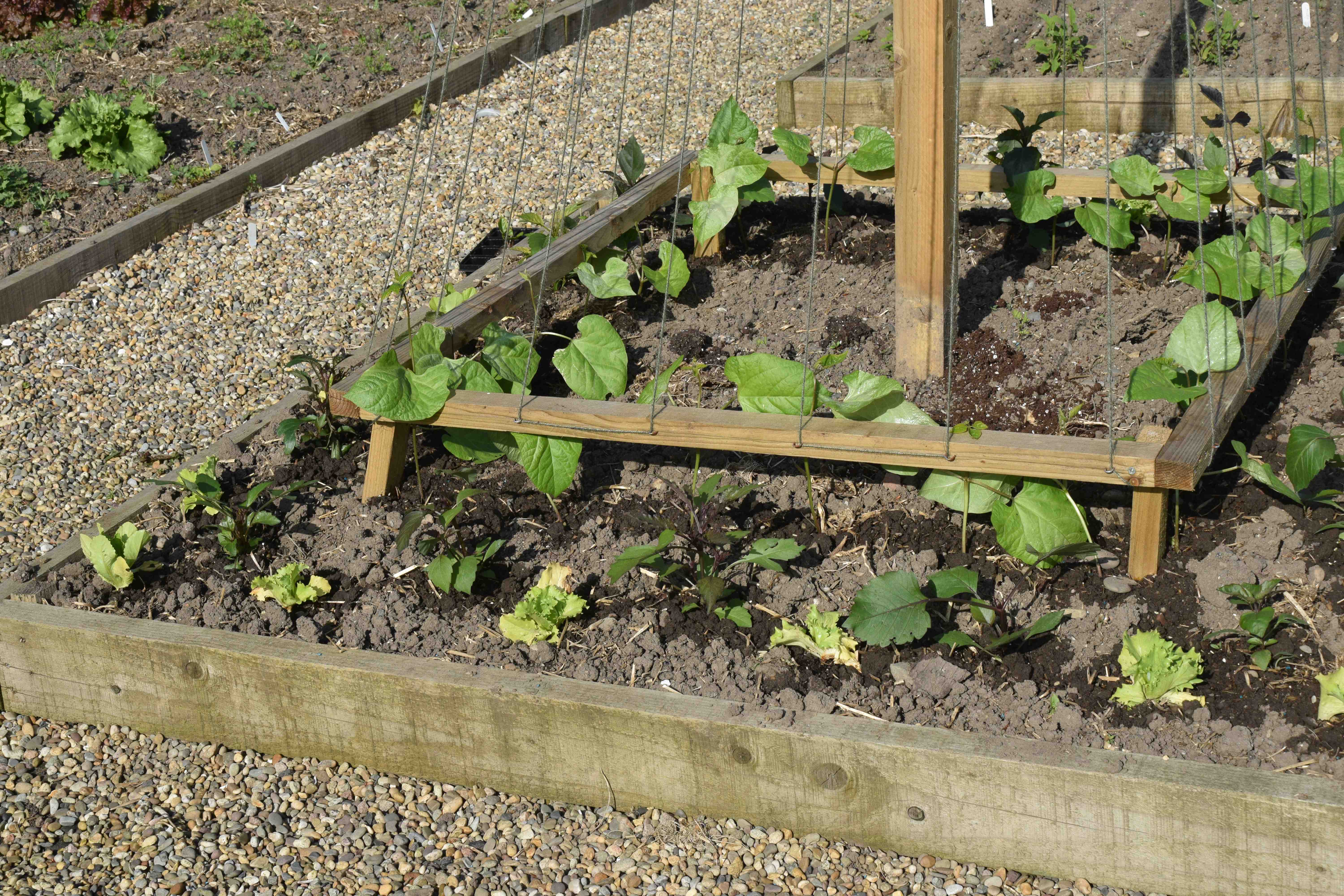 The runner beans, which were sown a month ago, one to a cell, were planted out a week or so ago and although the leaves got a bit scorched with all the heat and sun we have had in the past week or so (sorry those in the east of England!) the growing points are doing well and are starting to twist up the twine.