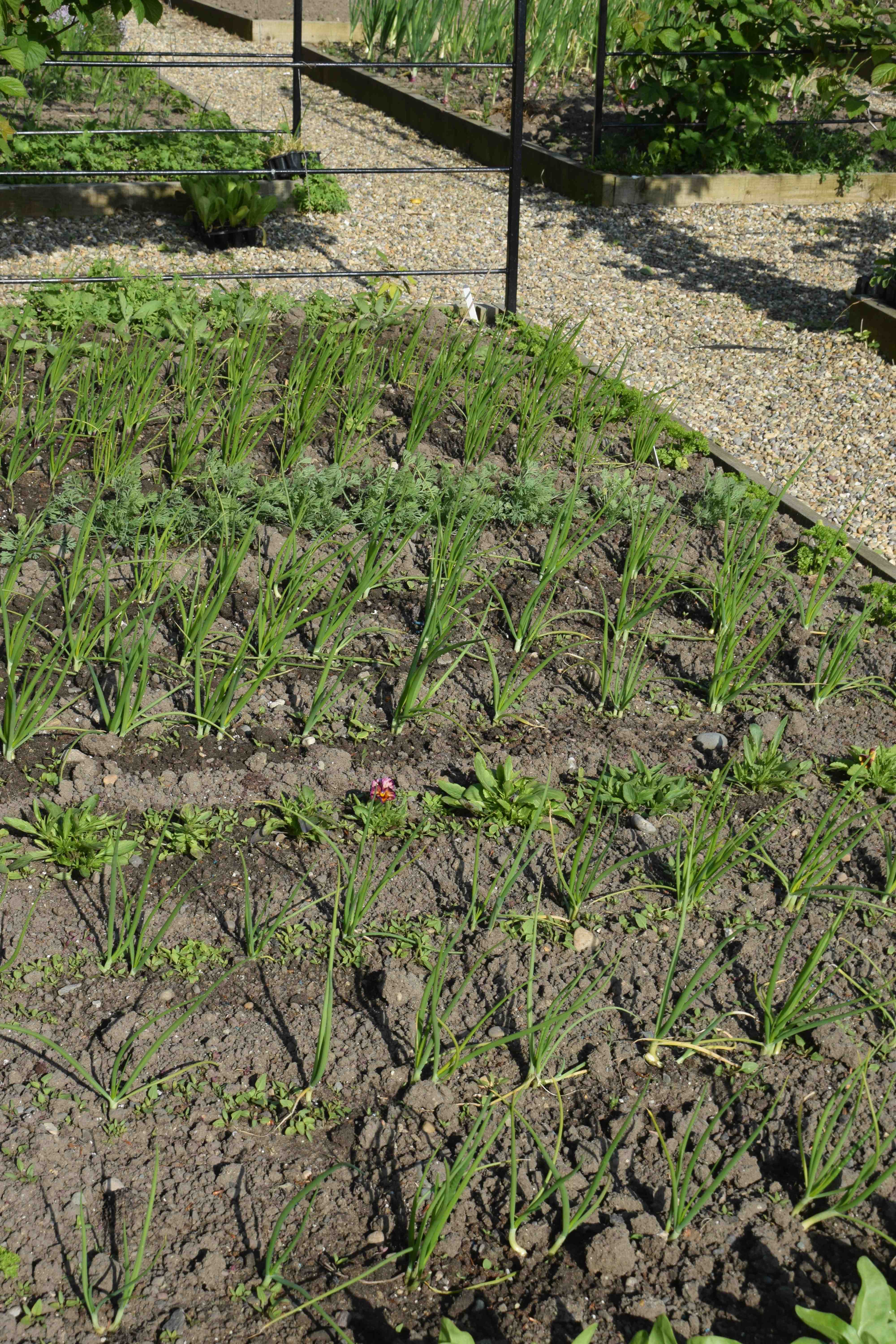 The onions from seed, sown in cells in March, are doing well now we have had some good weather and I have watered them since we need to get some good growth on them before mid summer’s day, which is only a few weeks away. After that they stop producing leaves and start to swell the bulbs – we hope. They will get another dressing of chicken pellets next week if some rain is forecast. These are in small clusters of two or three seedlings. If left they will each make a small bulb but I will pull them as scallions to thin them out too.