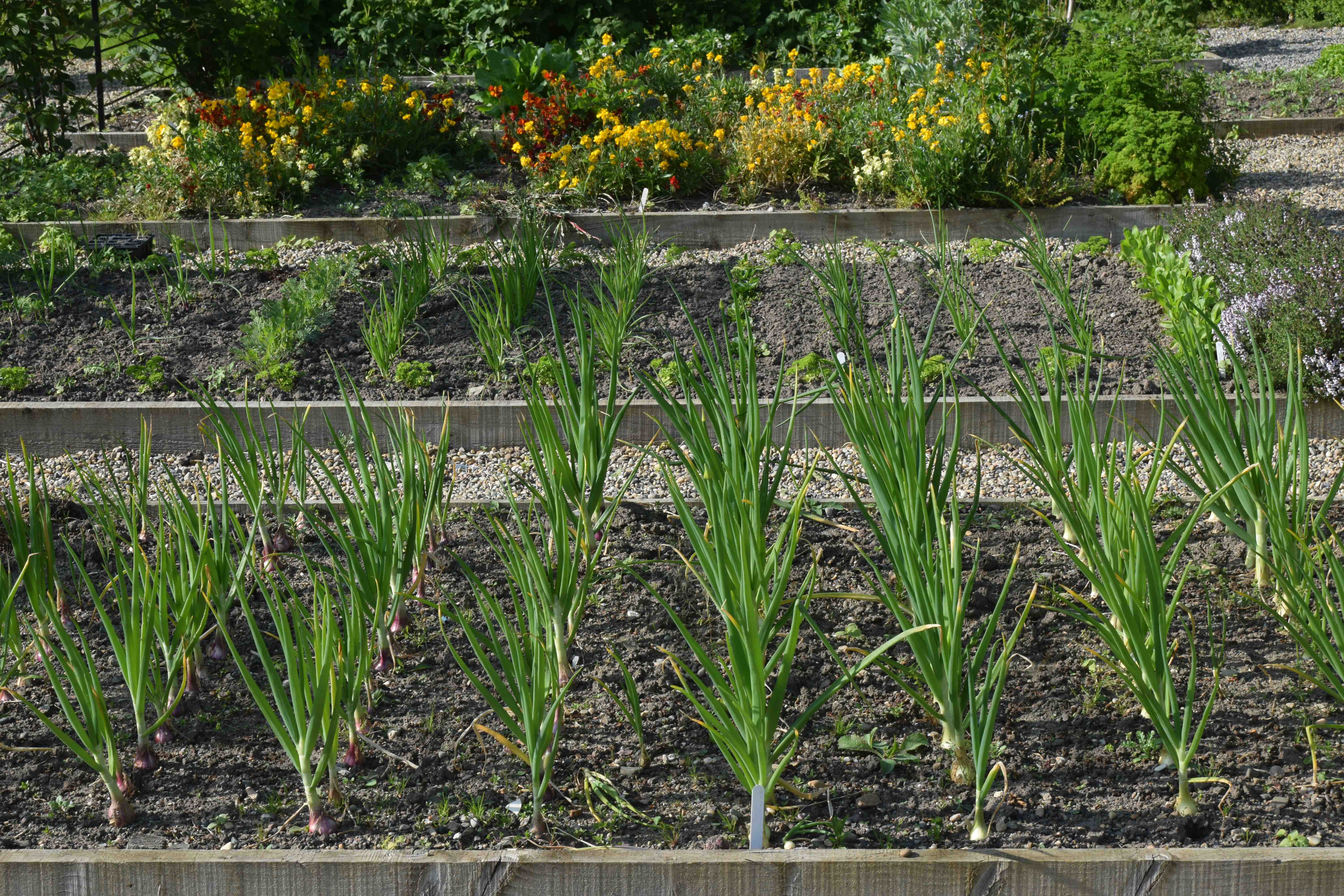 There are two main batches of onions and the autumn planted sets are doing very well now except that quite a lot are bolting. These plants which produce flowering stems will not make good bulbs. They can be used at this young stage but you have to cut out the flower stem which is tough and woody.