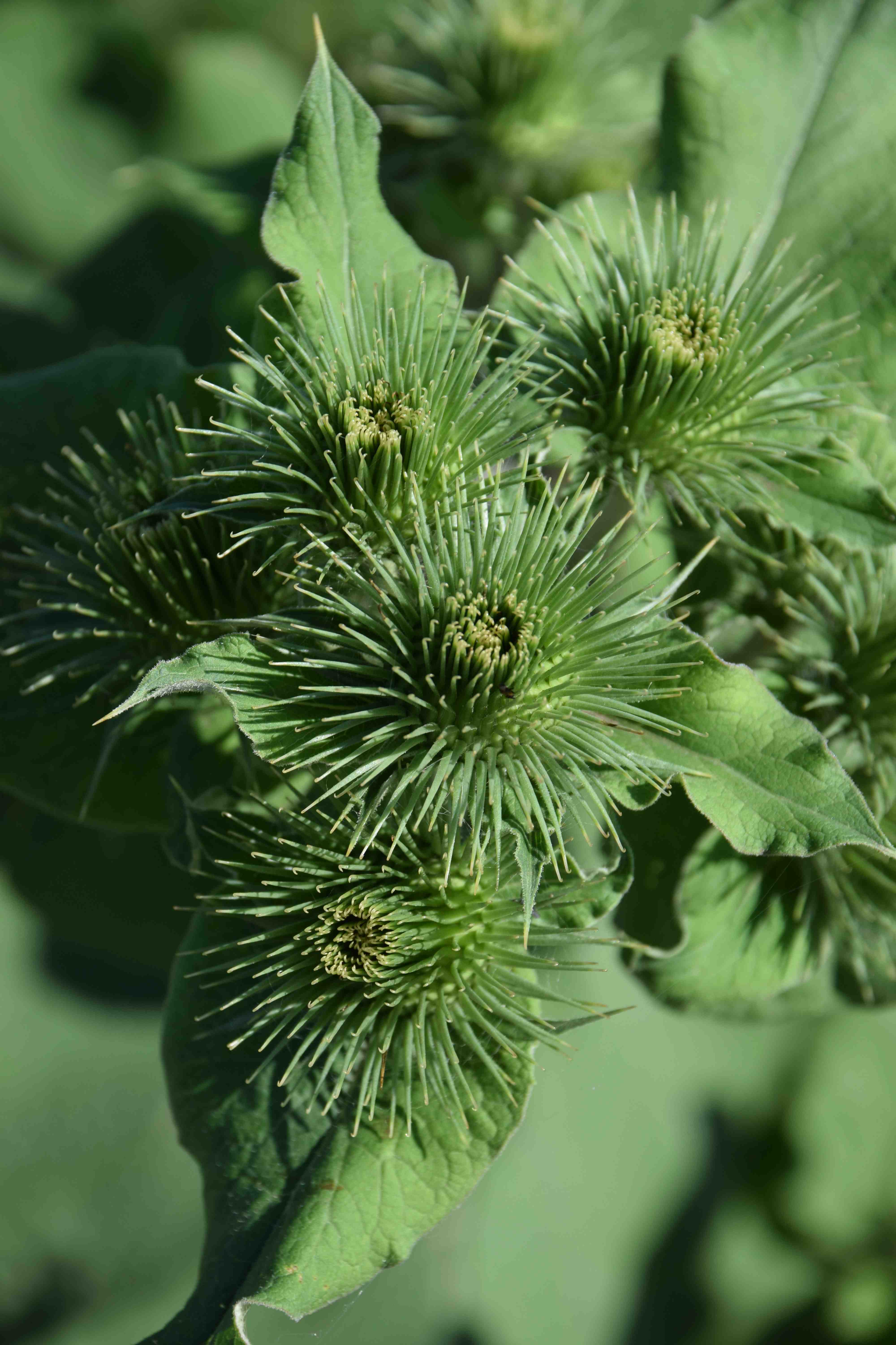Burdock is a plant that you are more likely to notice on your socks than in the wild or in your garden. The perfectly designed hooks at the ends of the bracts surrounding the clusters of rather dull, mauve flowers ensure that, when the seeds are ripe, anything with fur, from a rabbit to a gardener, will carry the seeds far and wide. Burdocks are found throughout the northern hemisphere and in the UK tends to grow most frequently in wasteground and poor, dry soils where its deep roots can find moisture and nutrients. It produces large, heart-shaped leaves in rosettes, dull green above and silvered below and then stems to 1m high with well branched clusters of flowers. It is thought that the name arctium is derived from the word for bear (arktos), because of the roughness of the burrs and lappa means ‘to seize’. Burdock is a fairly easily explained combination of burr and dock, because of the large leaves which vaguely resemble docks. The ability of the seedheads to stick to clothing has not been lost on people over the years. Apparently, in Queensferry, Edinburgh, the annual ‘Burry Man’* ritual takes place in August, when a man, covered in burrs walks through the streets to bring good luck, after which the costume is burned.