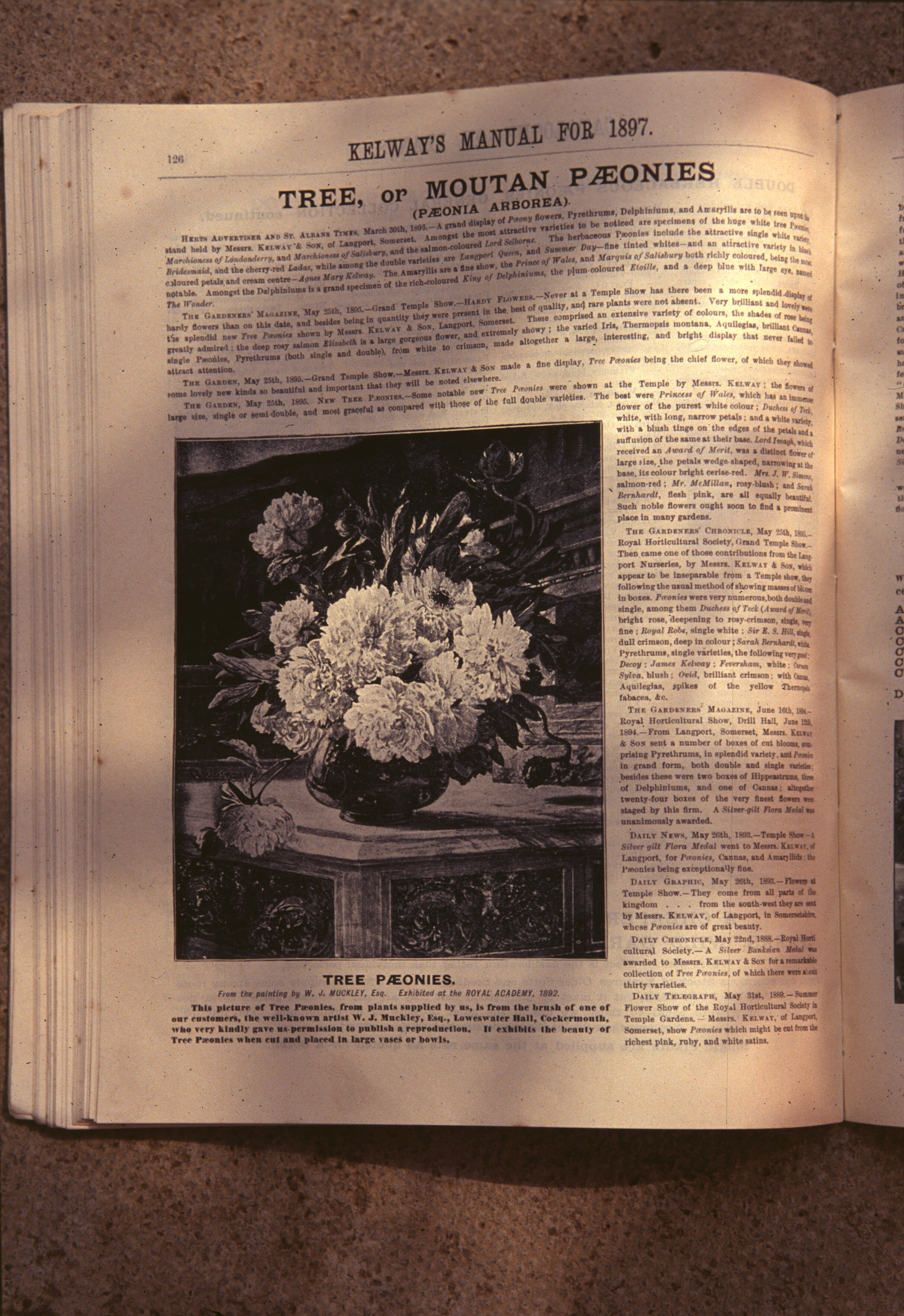It is probably an odd time to post about iris except, of course, that now is the time to divide your crowded clumps of bearded iris so they have time to make roots and get settled before winter. But because scanning has uncovered plant photos as well as myriad other oddities, and these photos came to light, I thought I would mention some. It was a trip to Kelway’s at Langport, Somerset when the company was, from memory, restructured and was giving itself a boost. In fact Kelway’s were a company I had used years before – I think it was my first ever big mail order purchase and it included peonies. The company was founded by James Kelway in 1851 and from the original 2 acres he finally had more than 200 planted with peonies and other plants and vegetables. His first love was gladioli but it was the peonies that were to make the company famous.
