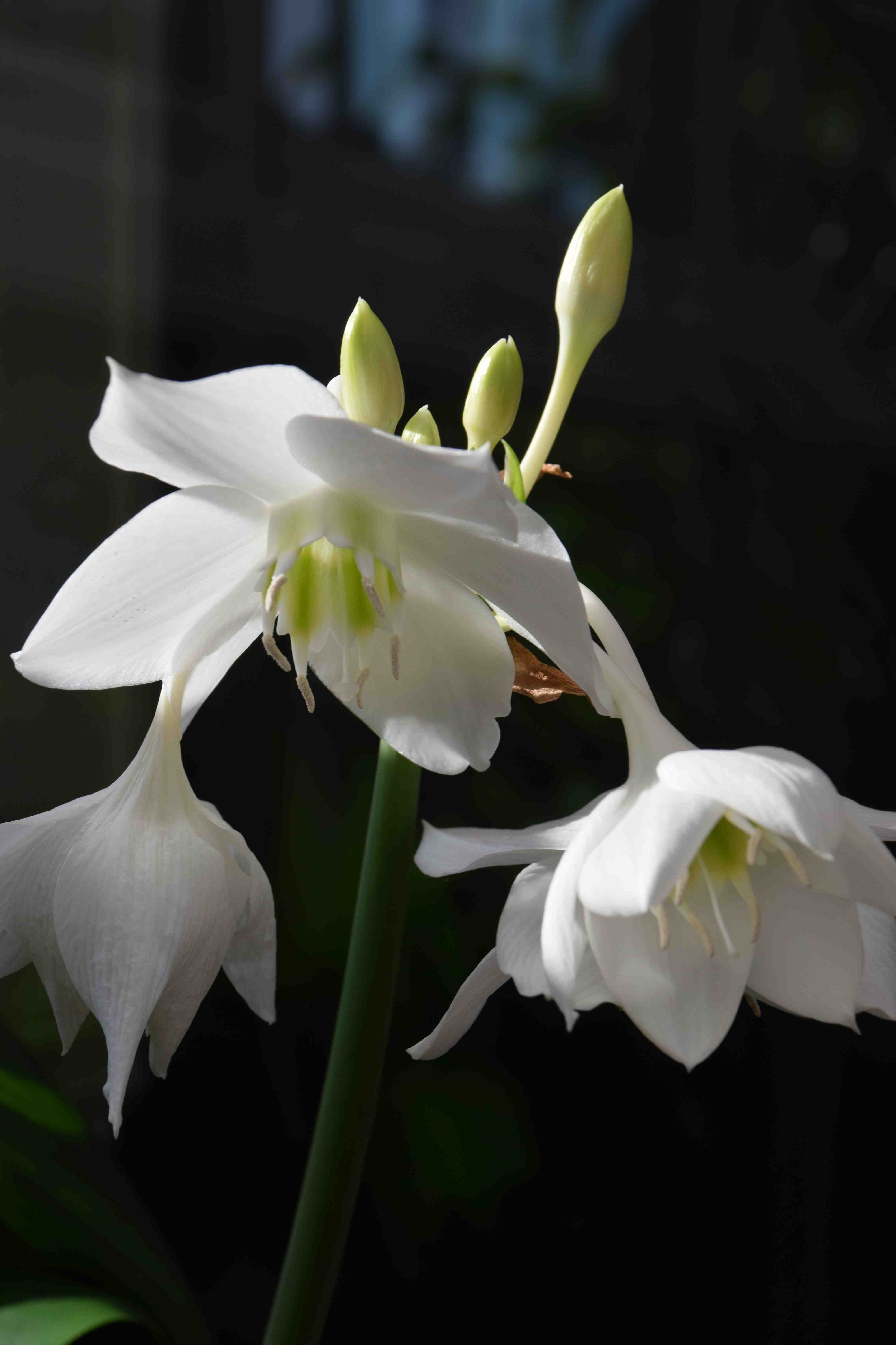 I would suggest that a minimum of 10c is needed in winter. This plant is in the conservatory which can get cold in winter despite the fact that I would rather pay to keep the plants warm than me so it has a storage heater all to itself. It is free from frost though. It faces north so the plant rarely gets direct sun. All the Eucharis amazonica in cultivation is thought to be a single clone, from one collection, and that seed has never been produced in cultivation (re. Pacific Bulb Society). Flowering is triggered by stress, either through chilling or drought and blooming seems pretty random on my plant. But it is very welcome. Up to ten buds are carried on each scape and the buds stand upright as they push through the spathe and then move to the horizontal as they open and the fading flowers hang down – all very elegant. The blooms are about 12cm across and pure white with green bands in the cup. They are pristine and lovely and enhanced by a sweet perfume.