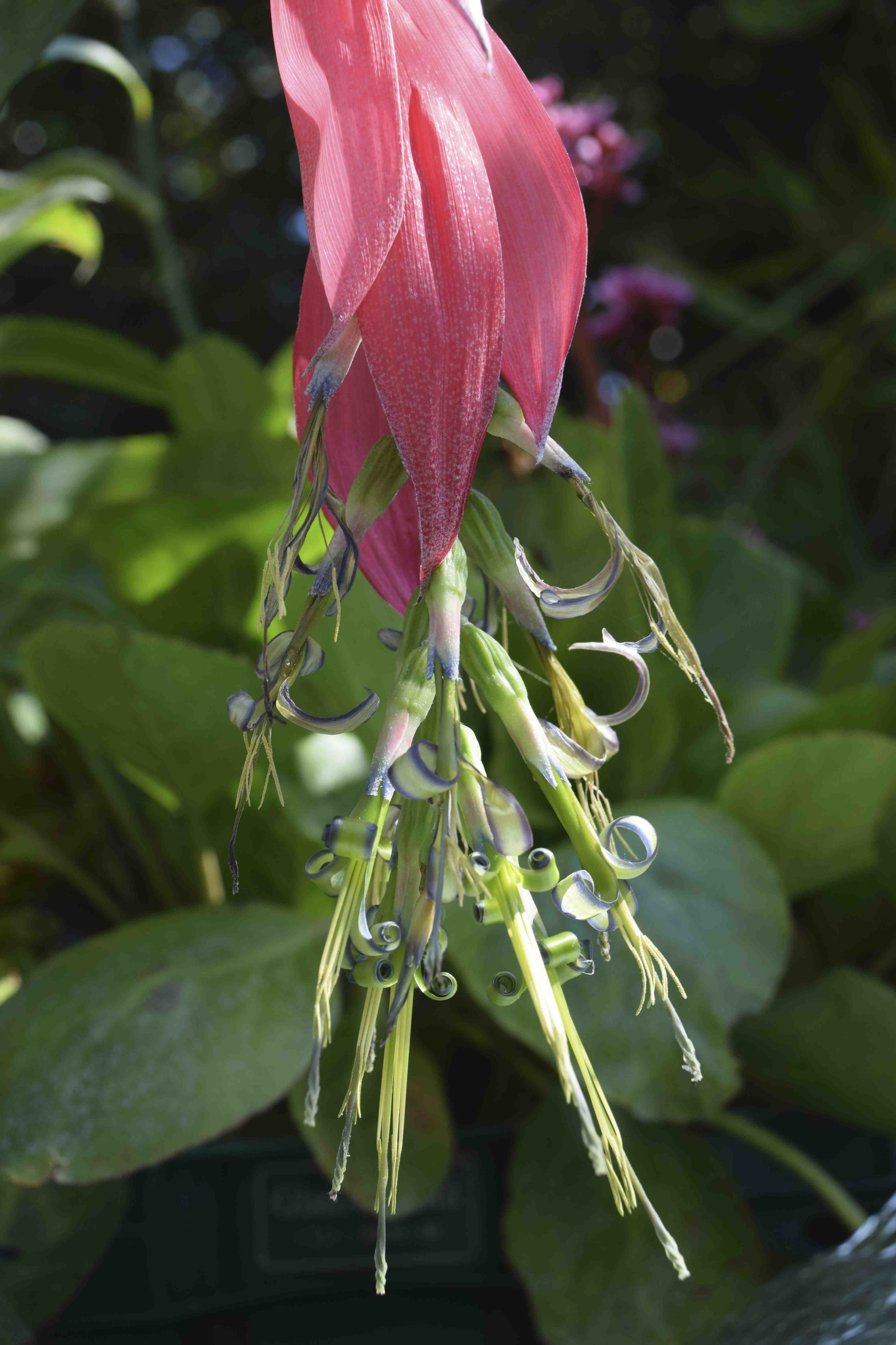 Perhaps yesterday’s close up stumped some of you – it certainly looks more like a clock spring than a conventional flower. But it was the ‘three-on-three’ flower of a bromeliad, with three sepals, in this case with blue tips, and three longer petals, green, edged with blue and curling tightly. Bromeliads are best known by the pink-bracted houseplant – Aechmea fasciata and Ananas comosus, the pineapple, but I have known and grown bromeliads of some sort most of my gardening career, and this has mostly meant billbergias. Billbergia (named for the Swedish botanist Gustaf Billberg) is a large genus with mostly epiphytic (perched on branches or rocks rather than growing in the soil) plants from Mexico, Central and South America and the West Indies. Like most bromeliads the leaves form ‘vases’ that collect water but the most commonly cultivated billbergias have rather narrow leaves and form wide clumps so the vases are less obvious than in some others. Like others though, the flower stem is produced from the centre of the vase and once it has been produced, the rosette dies. But sideshoots are produced from the stem at the base so the plant itself does not usually die, though some genera are monocarpic – just not bilbergias.