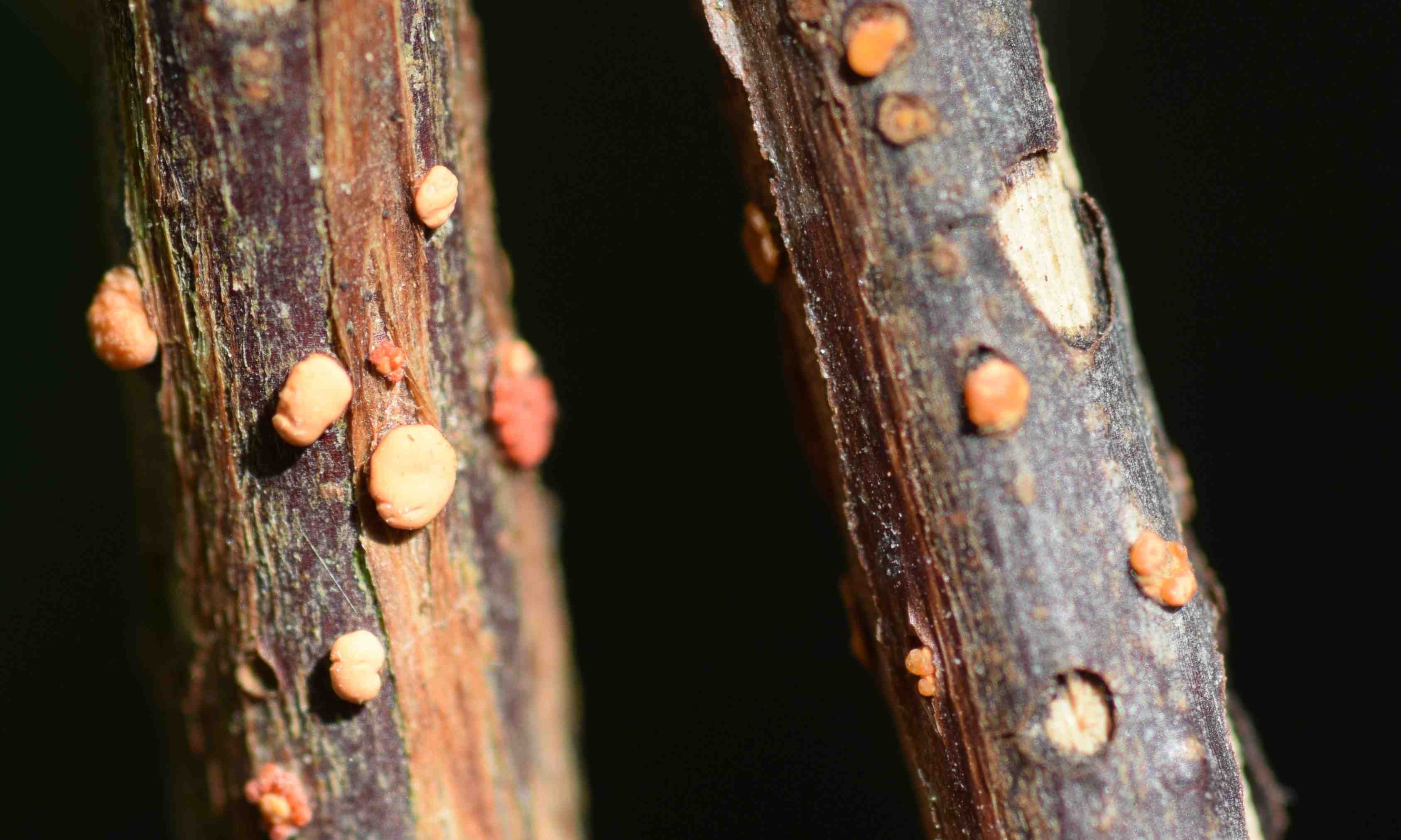 If you are doing any pruning or trimming of shrubs in the next few months you are very likely to find this little fungus. Aptly named coral spot for the colour and shape of the fruiting bodies, this fungus is chiefly remarkable for not having had its name changed – it is still the Nectria cinnabarina that it was when I first learnt it! It is very common on beech and hornbeam, especially hedges where there are lots of cuts and snags, but it can be found on many shrubs and my sample was on an old ribes. It is a saprophytic fungus, meaning that it lives on dead plant material but it can also invade living tissue. It is also very common on chaenomeles, the plant I associate with it most. Because it mostly infects dead plant tissue it can be found on woody twigs and debris laying around the garden including bean poles and pea sticks.