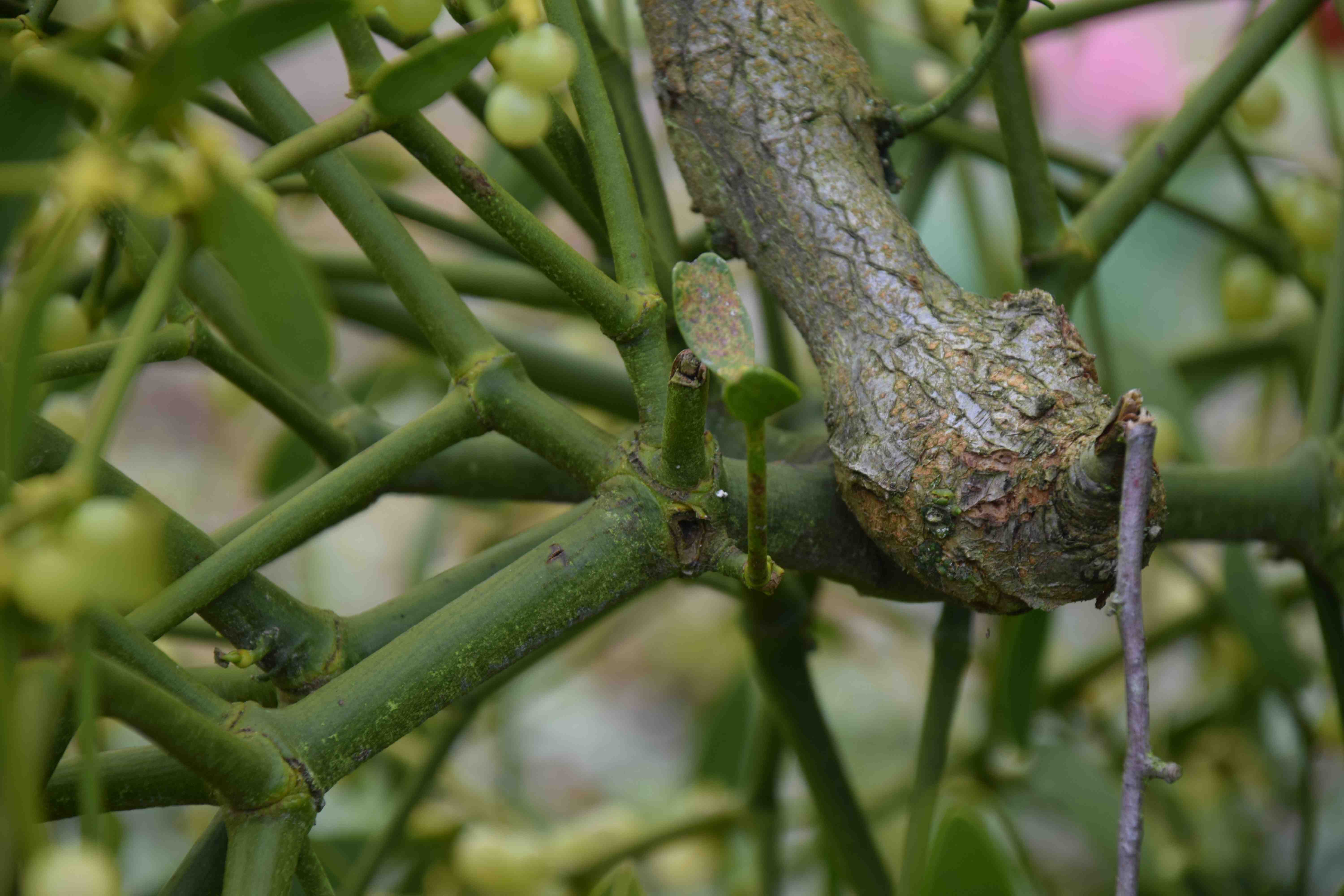 Rather less exotic is mistletoe. In the UK we blithely go on about mistletoe but our native Viscum album, is just one of the many mistletoes (members of the Loranthaceae family) that are found across the world, all growing on, and in, the tissues of host plants. Our version is only a semi-parasite because it has pairs of green leaves on its branches that can manufacture food for the plant. The idea of parasites suggests that the mistletoe will kill the host but that is never in the interest of the parasite because then it will die, along with the host. But mistletoe will damage a host plant and as the plant gets bigger the load on the host increases as it needs more sap and it is possible for the end of the branch to decline and even die.