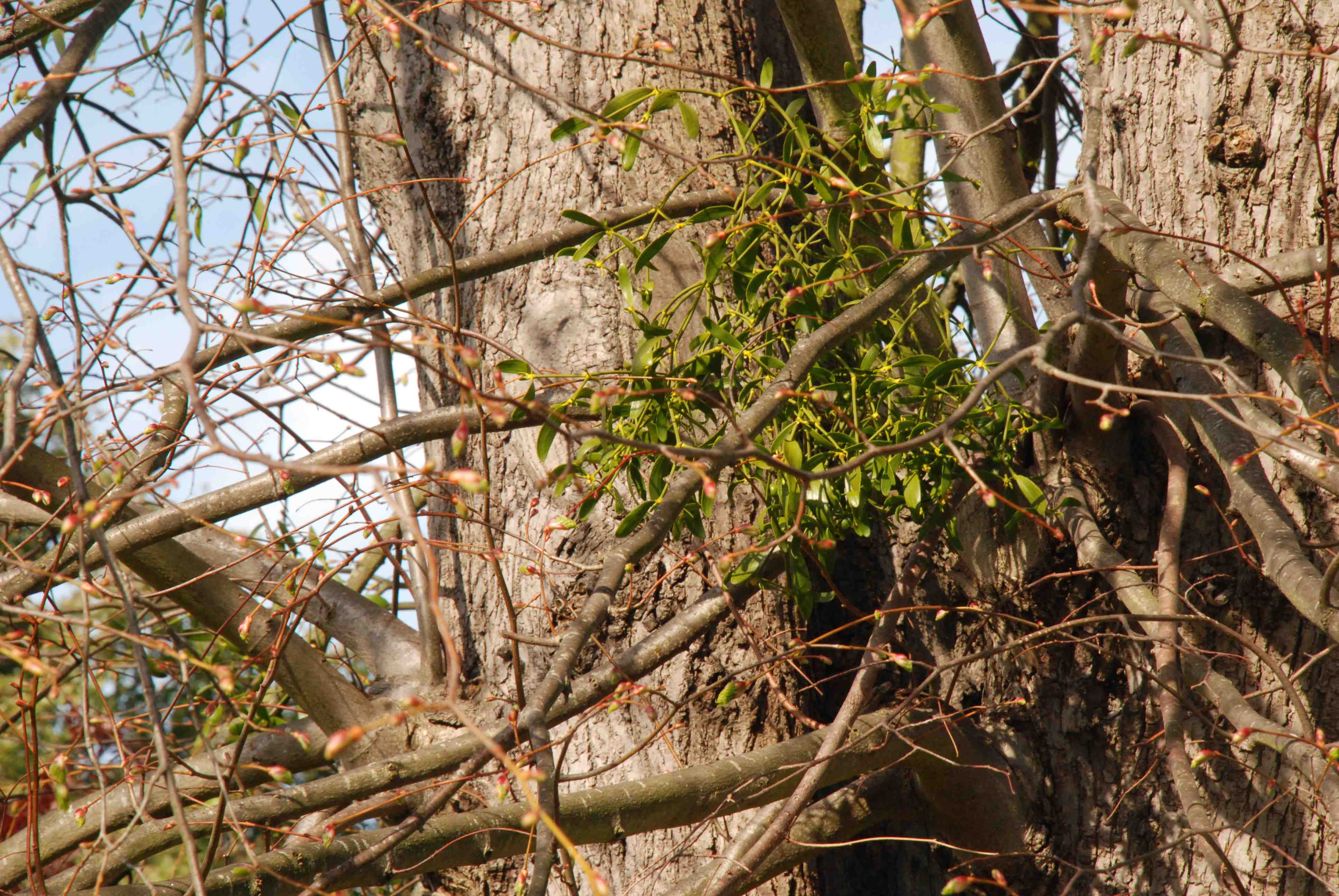 It is often, rightly, written that the seeds are spread by birds, but they do not always pass through the digestive system. Mistle thrushes and blackcaps treat them in different ways. The thrushes eat the berries and excrete the seeds in sticky strings while blackcaps wipe. They eat the sticky white flesh (Viscum album means, literally, ‘sticky white) and wipe the seeds off their beaks onto the bark of the branches. It is here, pushed into the crevices of the bark, that the seeds germinate and push their haustoria into the cambium (active tissue just below the bark) and, after a year or two, send out the first pair of leaves. The plants grow very slowly, producing just one pair of leaves and a stem each year to increase the length of each stem, though each does divide in two so the clump gets wider and wider. Mistletoe is dioecious, meaning that male and female flowers are produced on separate plants. If you have just one clump on a tree it may not have berries if it is a male or a lonely female. Of course, we all want berried twigs at Christmas.