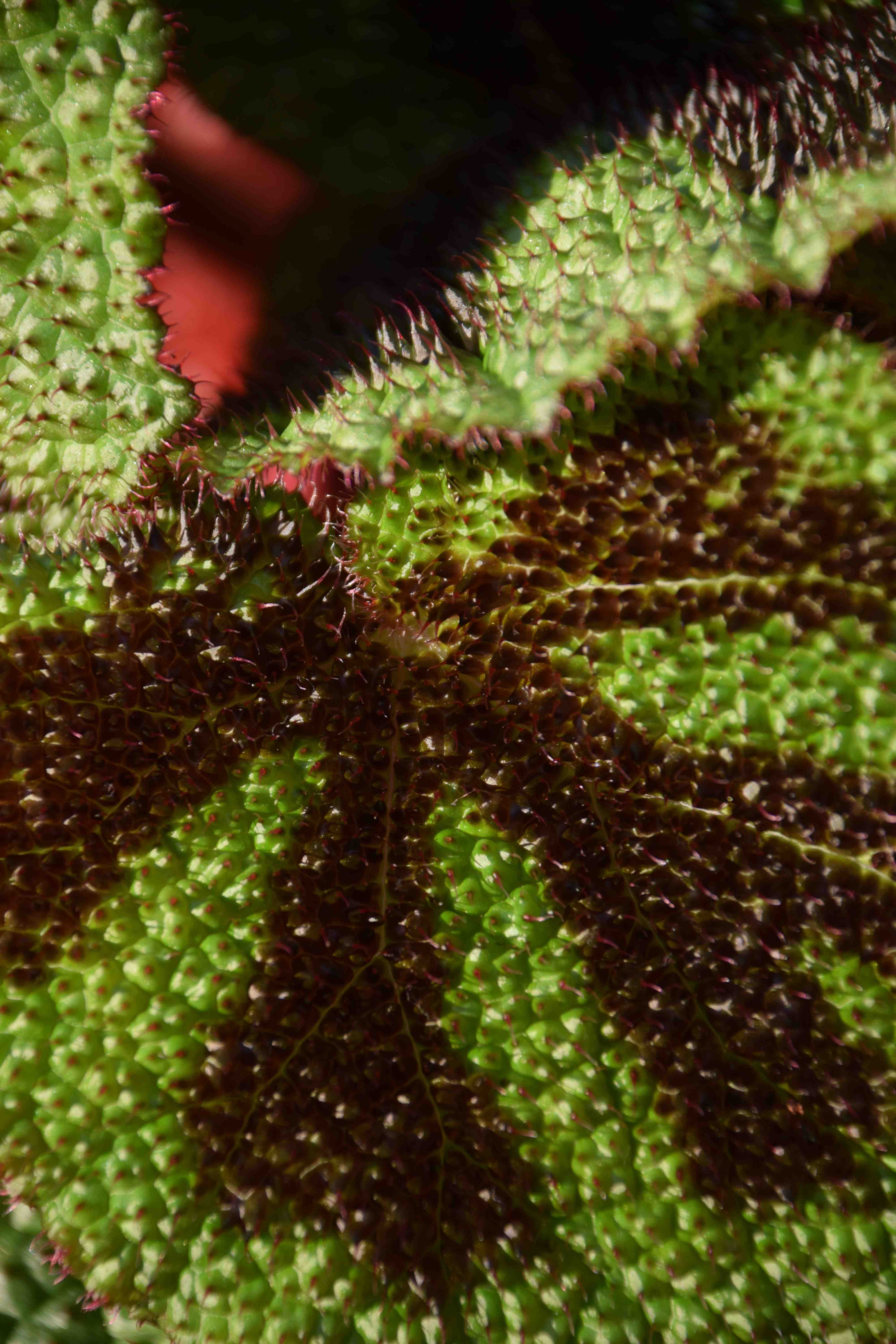 This shot, as we pull out, may be easier to recognise because this is one of the most distinctive of all begonias. Begonia masoniana, commonly called the iron cross begonia because of the distinctive leaf marking, is one of the species called a rhizomatous begonia because the stem creeps over the soil forming an ever-expanding clump with leaves on individual petioles growing from the upper side and stems of flowers that are slightly taller than the leaves, which form a clump about 30-40cm high. The leaves can reach about 20cm across in adult plants and they have a marvelously puckered surface with raised pimples between the veins, each with a single red hair.