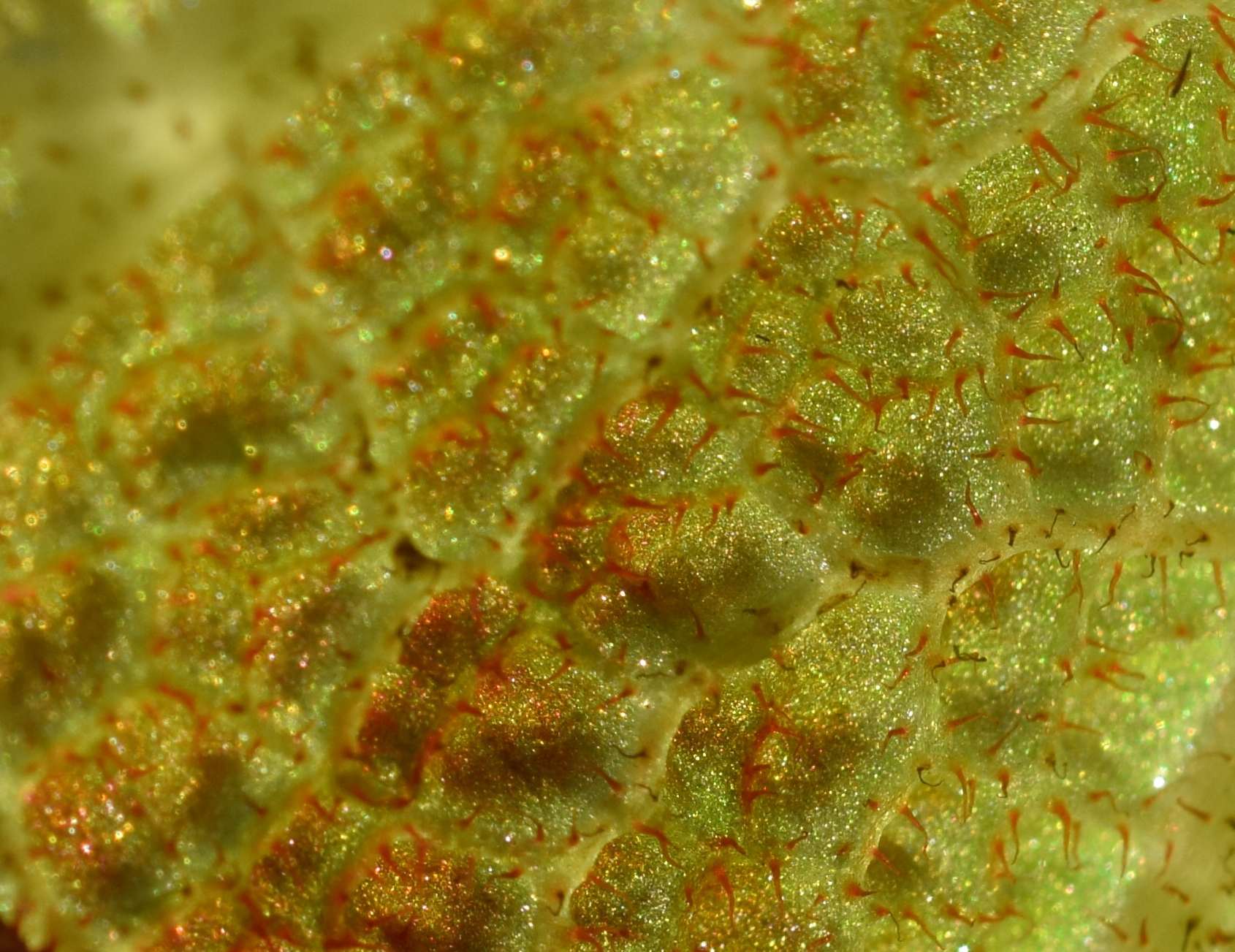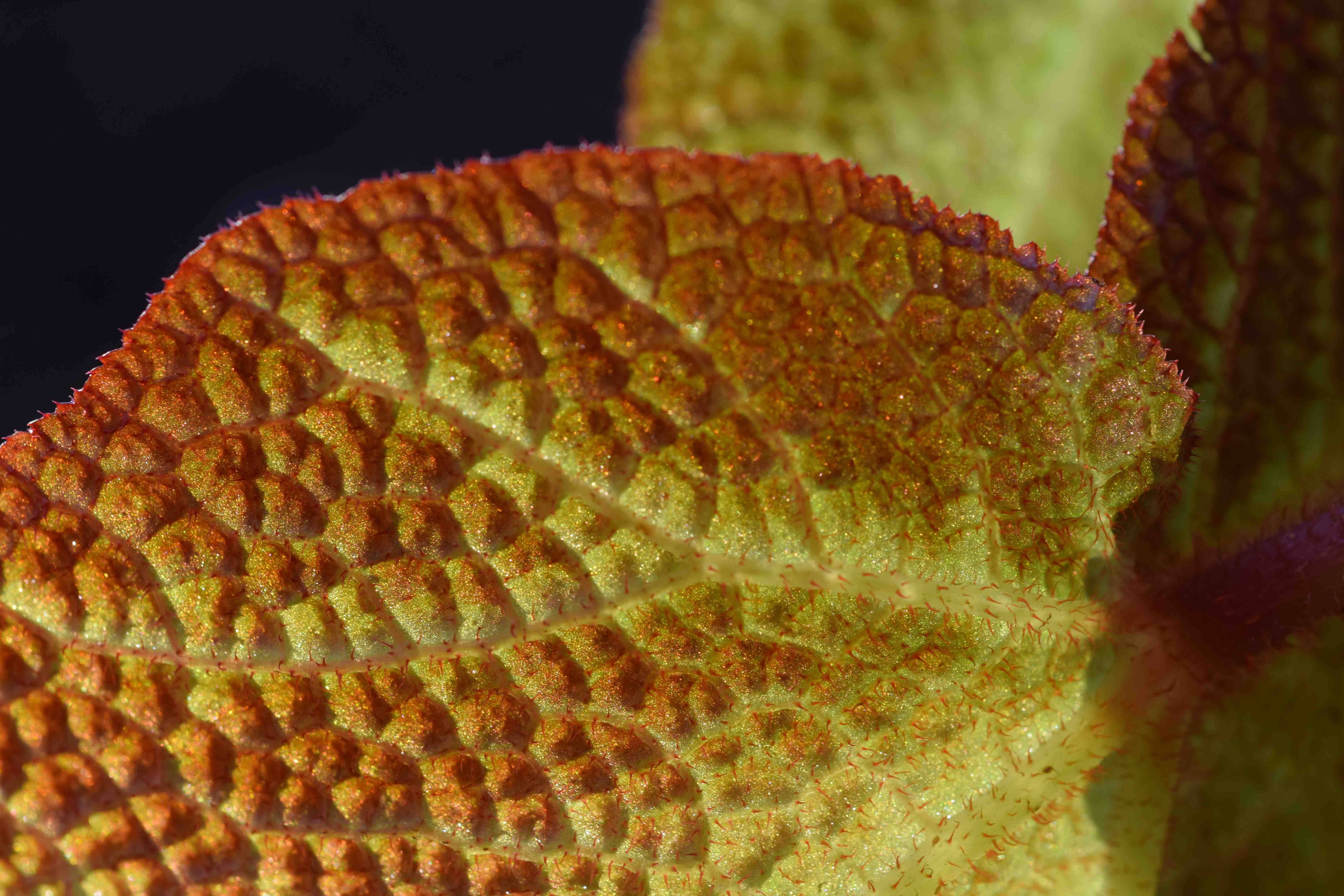 Even without this party trick this is a lovely little plant, about 20cm high, with interesting, puckered leaves and covered in red or golden hairs. The photos above and below are of the lower leaf surface showing the hairs.