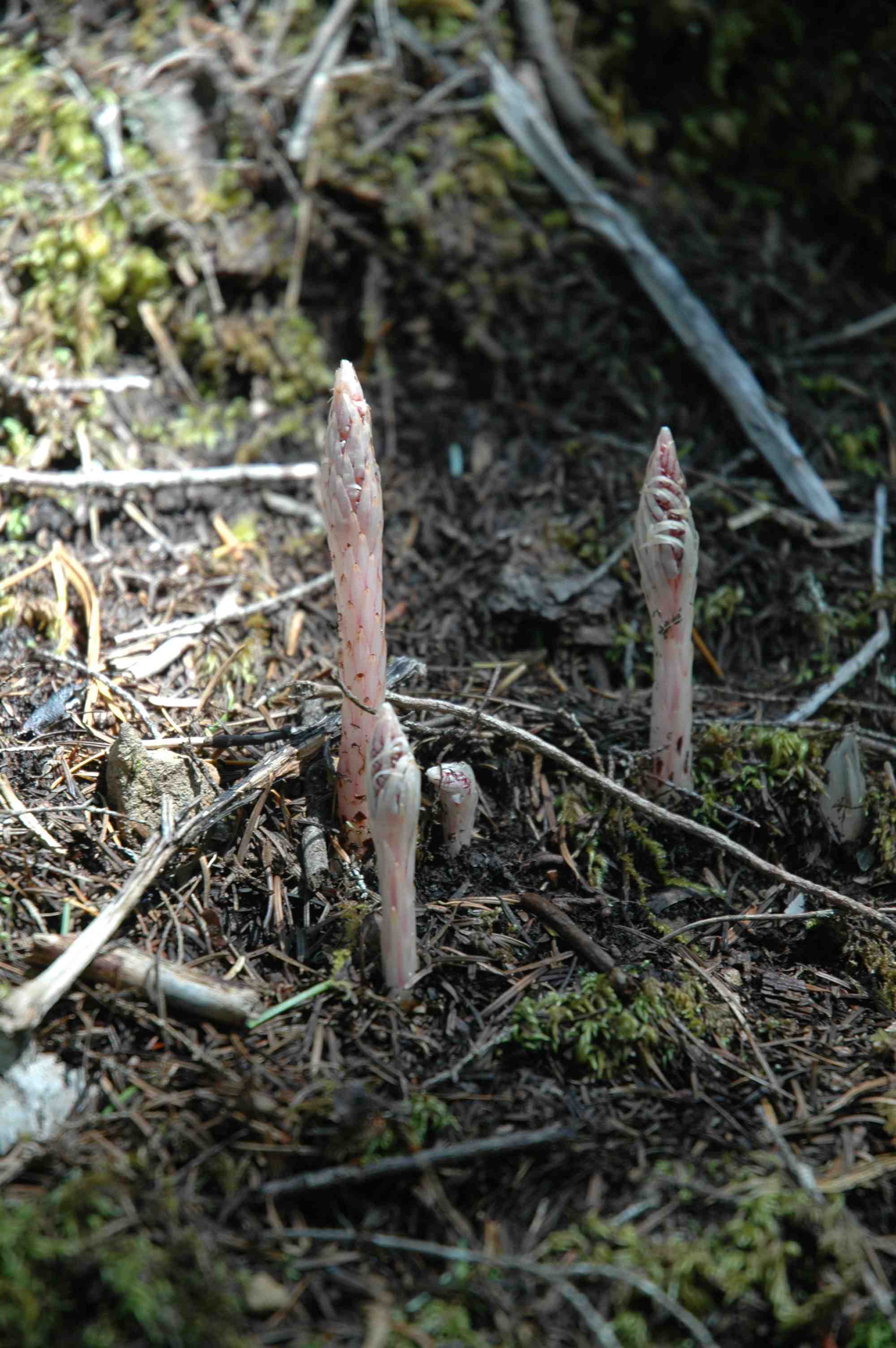 After the fiery chilli yesterday, here are sugar sticks to take the taste away, though I am not sure if these are really edible. But they are interesting and parasitic plants are always intriguing because of their curious lifestyle. Sugar sticks is the common name of Allotropa virgata and these photos were taken in the USA, in May, at Toketee Falls by the North Umpqua river in Oregon. I was a bit too early to see them in full bloom but the point of the plant – well the beauty, which gives it its name – is the white scapes, lined with bright red. It is found throughout parts of Oregon and south to north California and into Washington State in the north. Although a parasite it not parasitic on other flowering plants but on fungi. The fungus is Matsutake and the mycelium of the fungus feeds on conifers including various firs (Abies) and Western hemlock (Tsuga heterophylla). The candy sticks is termed a mycoheterotroph and cannot make its own food, deriving all its carbohydrates and presumably most other nutrients, from its host.