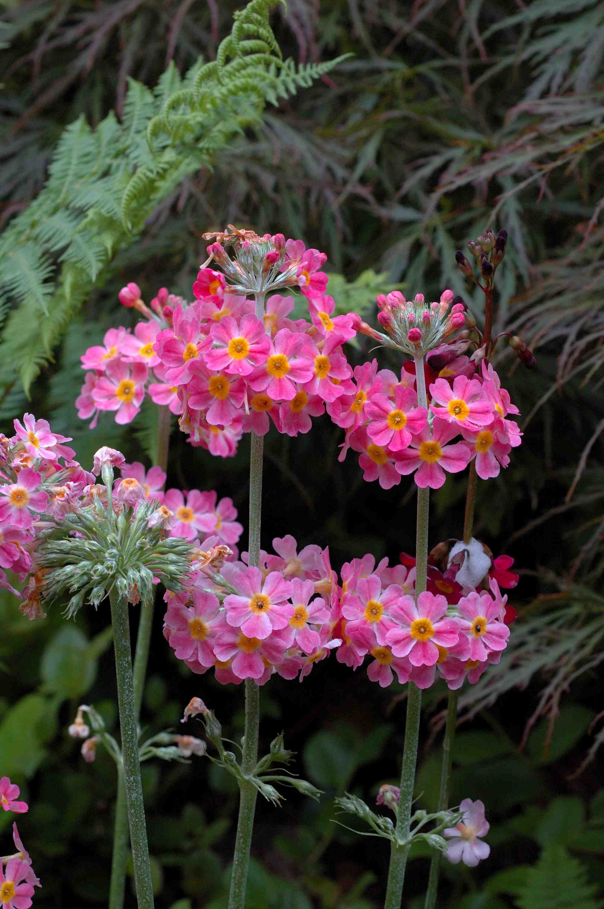 One of the latest to bloom and the most distinctive of all, is Primula viallii. The lavender flowers emerge from red calyces to give a red-hot-poker effect. It is easy to grow from seed but is generally rather shortlived.