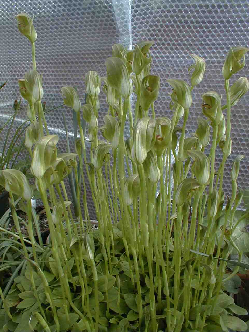 Commonly known as Greenhood orchids, for obvious reasons, the Pterostylis are terrestrial (growing in the ground) orchids from Autralasia. There are about 100 species and all have rather macabre, dull coloured, hooded flowers. I found this one (which I think is P. curta), easy to look after. Potted (or repotted since it increased fast) in late summer in gritty compost, it rapidly covered the soil surface with flat green leaves and then sent up a stem with a single flower about 4cm tall. It does not need great heat but it needs good light in winter when it is growing.