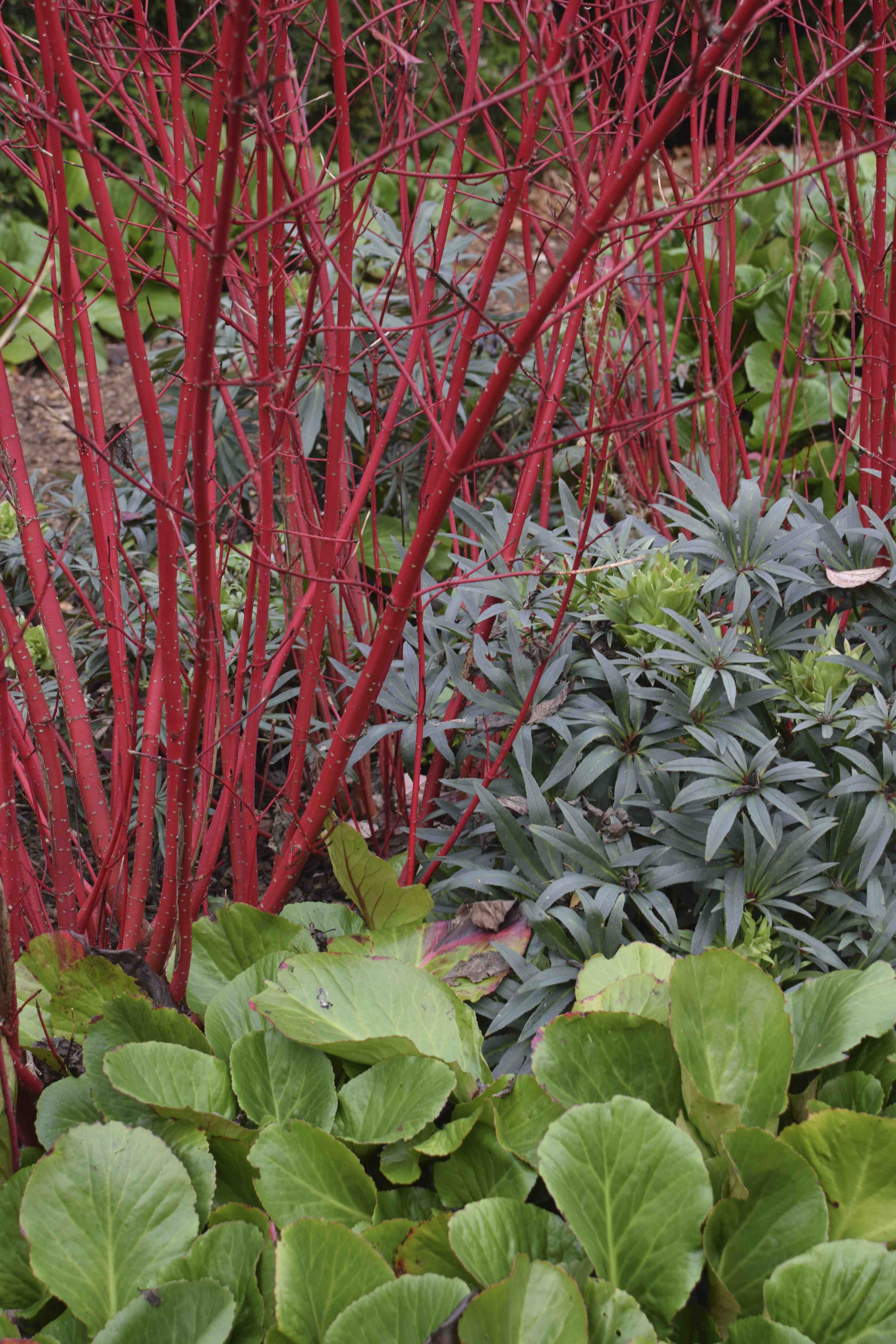 Height and bright red stems are provided by Cornus alba ‘Sibirica’ which glows in the winter sun. If you can’t stand the green foliage in summer then the variegated ‘Elegantissima’ may be a better choice though the stems are not as bright. You have to curtail the display a little by pruning in March every year or two to keep the shrub in shape and to encourage lots of young, bright stems.