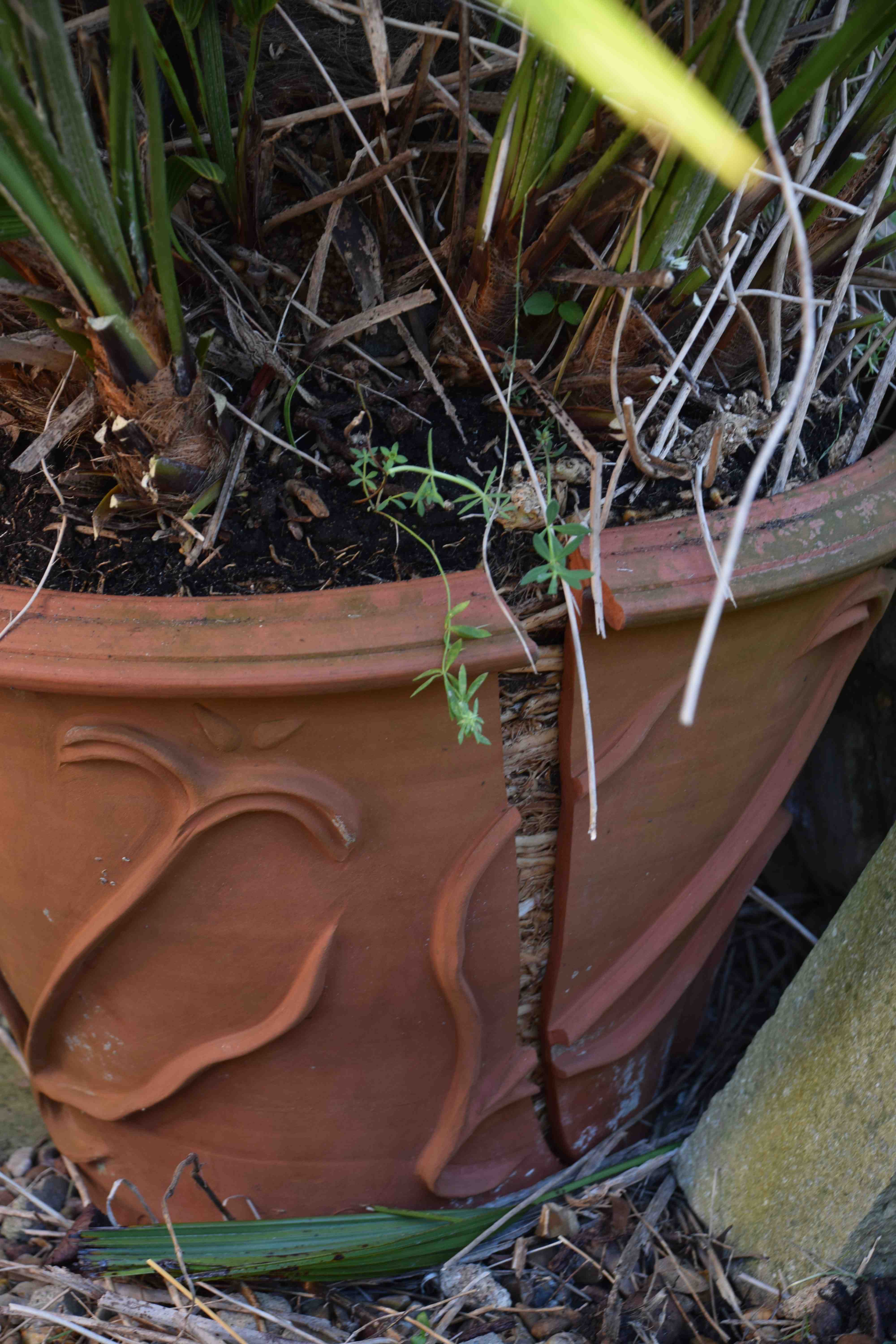 So it was with a sense of foreboding that I saw that the palm had got too big for its pot last year and had made its feelings known by splitting the pot apart. This meant that it had to be repotted and moved. This was going to be no mean feat as, in common with many palms, this one is beset with vicious thorns. So the first stage was to cut away a lot of the outer leaves and removing dead leaves, stalks and old flower clusters so I could get near it. I then had to break the pot so I could get to the roots and to the base so I could start to dig out and cut off the roots that had grown into the soil. I had to be quite vicious when doing this because a) I could not physically handle a larger rootball than in the pot and b) I didn’t have a pot much deeper than one it was in so I could not accommodate a very deep rootball.  So I had to be quite rough and chop off the roots. The danger of course is that most of the roots that are feeding the palm and taking in water will be here so it is going to be a shock to the plant. But I had cut off a fair few leaves so that will help. It is also spring, when the plant is just waking from winter so, hopefully, it will not sulk too much.