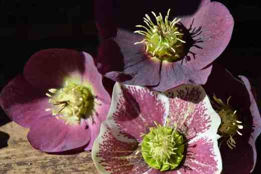 I was pottering around the garden yesterday and the sun was shining on the hellebores, inviting me to lift their heads and gaze into their faces. I just had to get the camera out. My selection is not comprehensive but here are a few of them that have been in the garden for years. If you do not have any in your garden, rush out and get some this weekend. The pleasure they give is out of proportion to the care they need – few plants are easier to grow in part shade.