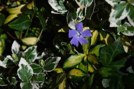 So here we have a pair of vincas. Above is Vinca difformis ‘Jenny Pym’ which is notable for the pink colour of the flowers. Vinca difformis is not actually native but a Mediterranean plant and is not always considered hardy though this has never had a problem in the 15 years I have had it. Vinca difformis has a habit of flowering in winter but it is at its best in spring, with odd flowers later in the season. It is most often seen as ‘Oxyloba’ which has large, starry, blue flowers. The name ‘difformis’ comes from the habit of the plant which has two types of stem: long, arching stems that spread it, rooting as they touch the soil, and short, flowering stems that grow from this. In time it can form dense groundcover but when it comes to clear it you find that it is actually rooted in relatively few places so removal is not the nightmare you expect. Thriving in partial shade but also happy in sunnier places than native species, it is a valuable thing to have where you can give it a bit of elbow room. It is too tall, at about 30cm, to underplant with bulbs, but it is nice to have wandering under shrubs. I like the glossy foliage and admire the pretty flowers.