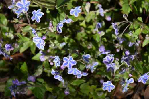 Yellow is the colour of spring but there other shades; blue is pretty common too. One of the prettiest spring flowers is Omphalodes cappadocica, a tough little cookie from Turkey. It is no great shakes in summer with mid green, typically roughish leaves for Boraginaceae and a rather woody-based, clumping habit. But in spring it is a charmer with bright blue flowers, most often seen as the cultivar ‘Cherry Ingram’ of prunus fame who got a mention last week. But I have, at present, just the rather more modern ‘Starry Eyes’. It starts to bloom at a height of just 10cm but as it grows it can double that. Growing well in sun or part shade and tolerating most soils except boggy, it is a great little thing.
