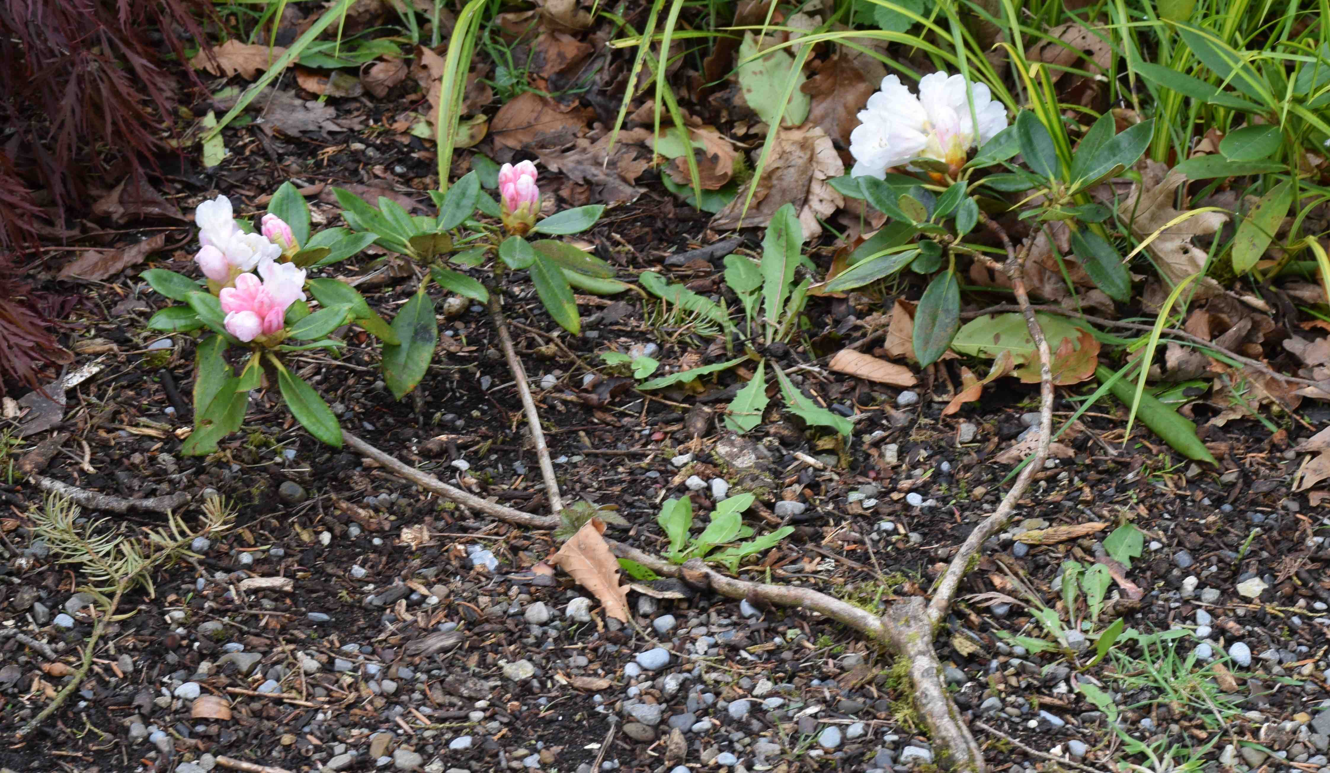 Can you work out the reason for this rather low-growing rhododendron? It looks like a ‘Yak’ (Rhododendron yakushimanum hybrid), but has a really prostrate habit. Can you guess why?