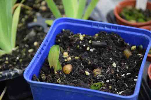 I have two clivia plants, one the standard, broad-leaved bright orange and another, with narrow leaves and golden yellow flowers which cost a lot more and is less common. If you ‘get into’ clivias you soon discover that there are dozens to collect, most at frightening prices, too much for me at the moment or in the foreseeable future. In spring I collected seeds from my plants, removed from their bright red (or yellow) cherry-like fruits, and sowed them, immediately. Like many amaryllidaceae, they do not store well and are best sown fresh. Clivia seeds are best sown on or near the surface of the compost but, with the move to Ireland, they got a bit shaken and disturbed so some were buried. But they started to germinate very quickly. The large seeds are rather odd in that they produce a thick root into the soil first and only later produce foliage, one leaf at first and then a second.