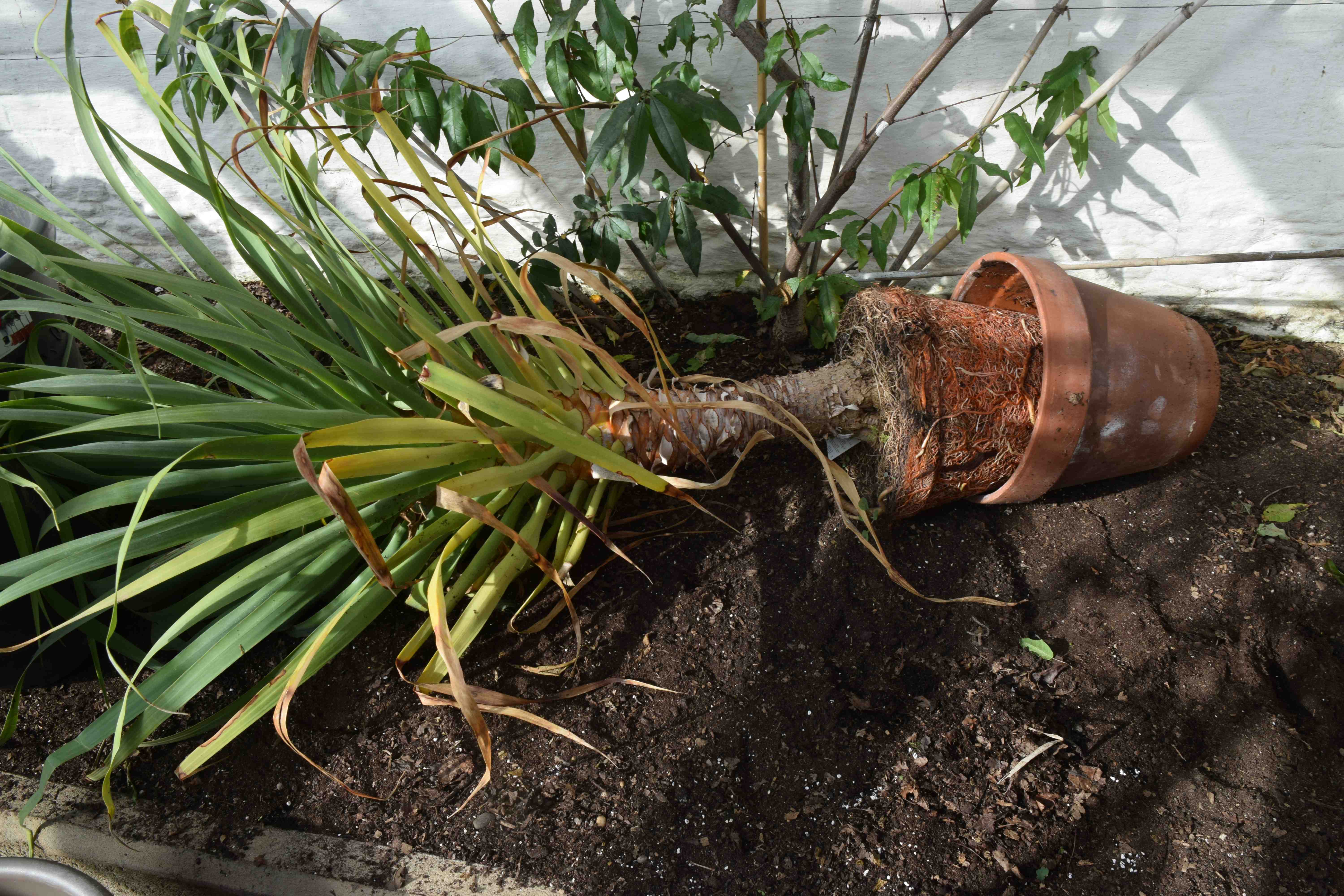 It took a while to extricate the plant from its pot. In fact I tried to repot it several months ago and have up. But with the plant on its side I carefully levered a trowel around the edge, then gave up. Then I tried again. And finally I succeeded in getting it out. It is not really the perfect time to repot the plant because there is a danger that the ’empty’ compost will remain wet in winter but needs must.