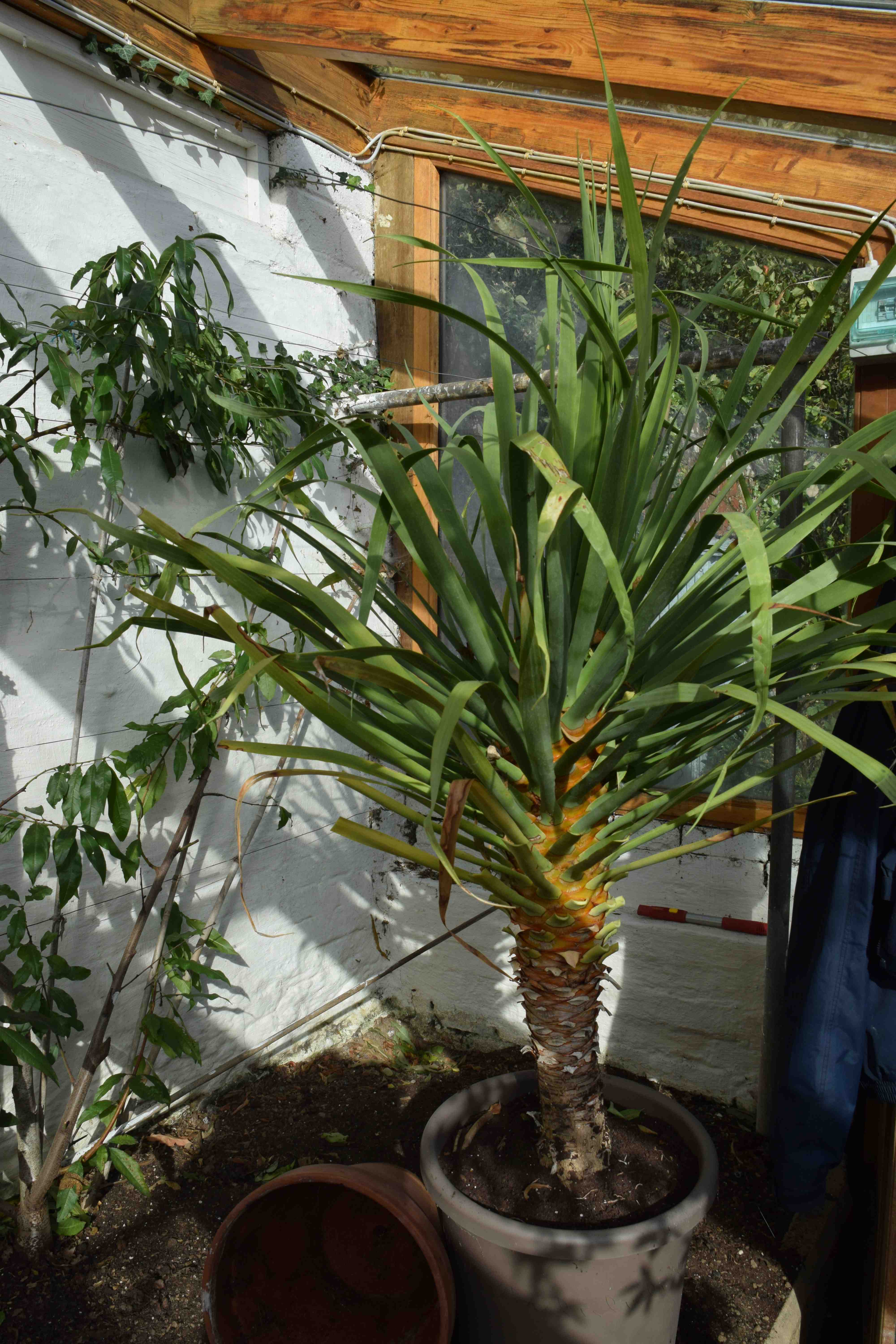 My dragon tree (Dracaena draco) is about 15 years old, I am not exactly sure of its age now and I am very attached to it. I had one many years ago and was pleased to see, when I visited Myddelton House earlier in the year, that it was still growing away well in the new greenhouse there. The one I have now was not left behind like that one and made the trip in the removal van on the hottest day of the year and was in need of a repot. The pot was packed with roots – obvious because it had made some looping roots above soil level. These plants also increase their stem girth as they grow so the trunk at ground level can be thinner than higher up. This is characteristic of monocotyledons which do not have the ‘usual’ ability to make secondary stem thickening and many have stilt roots that help support the mature plant.