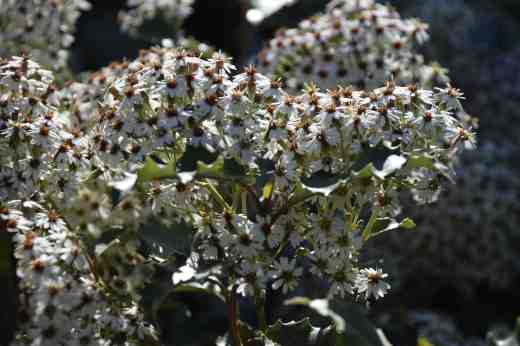 When the genus contains a beauty such as this it is inexplicable to me that the most widely available olearia is O. x haastii. This natural hybrid, first found in the Canterbury area of New Zealand more than a century ago, is available in every garden centre. It is the toughest and most hardy of them all but just because something doesn’t die doesn’t make it a good plant. I dislike everything about it. The dark green leaves are downy when young and the branches and reverse of the leaves retain this, something that is common in the genus. It has a dumpy habit and in July it produces lots of greyish white flowers and these have a pleasant smell.
