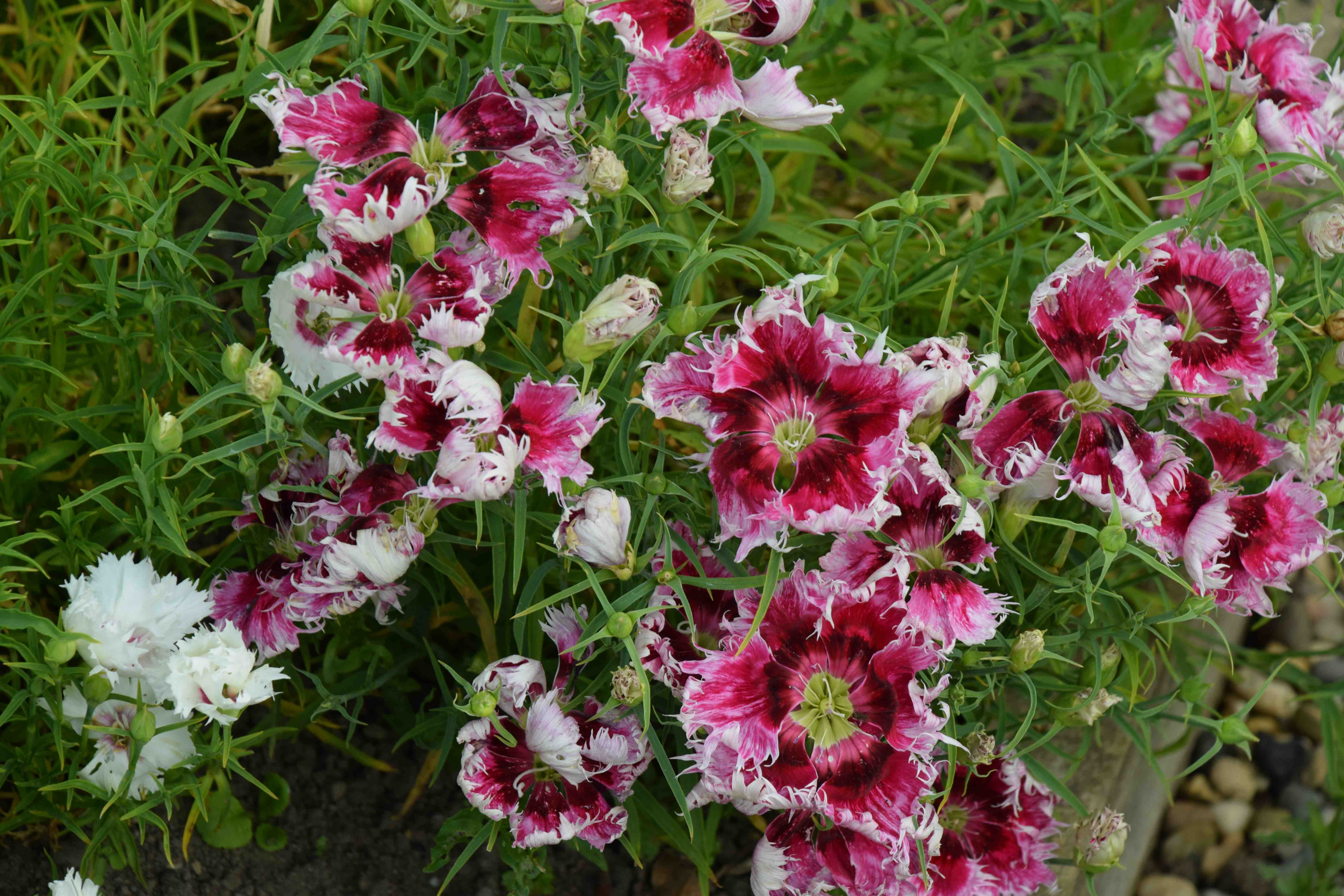 Back to now and the dianthus plants, which still looked pretty good at the end of autumn, were left in their beds to see what would happen. They looked less than happy at times but in early spring they perked up and started to produce lots of upright stems. Now they are starting to bloom. It is not the best mix of plants since some have no flowers yet while others are covered in blooms. But I like the way they combine the intricate markings of Sweet Williams with a neater habit and much larger flowers. The plants are about 20cm high and each one is different. I think they will be past their best at the end of summer but it should be possible to collect seeds from the ones I like best.