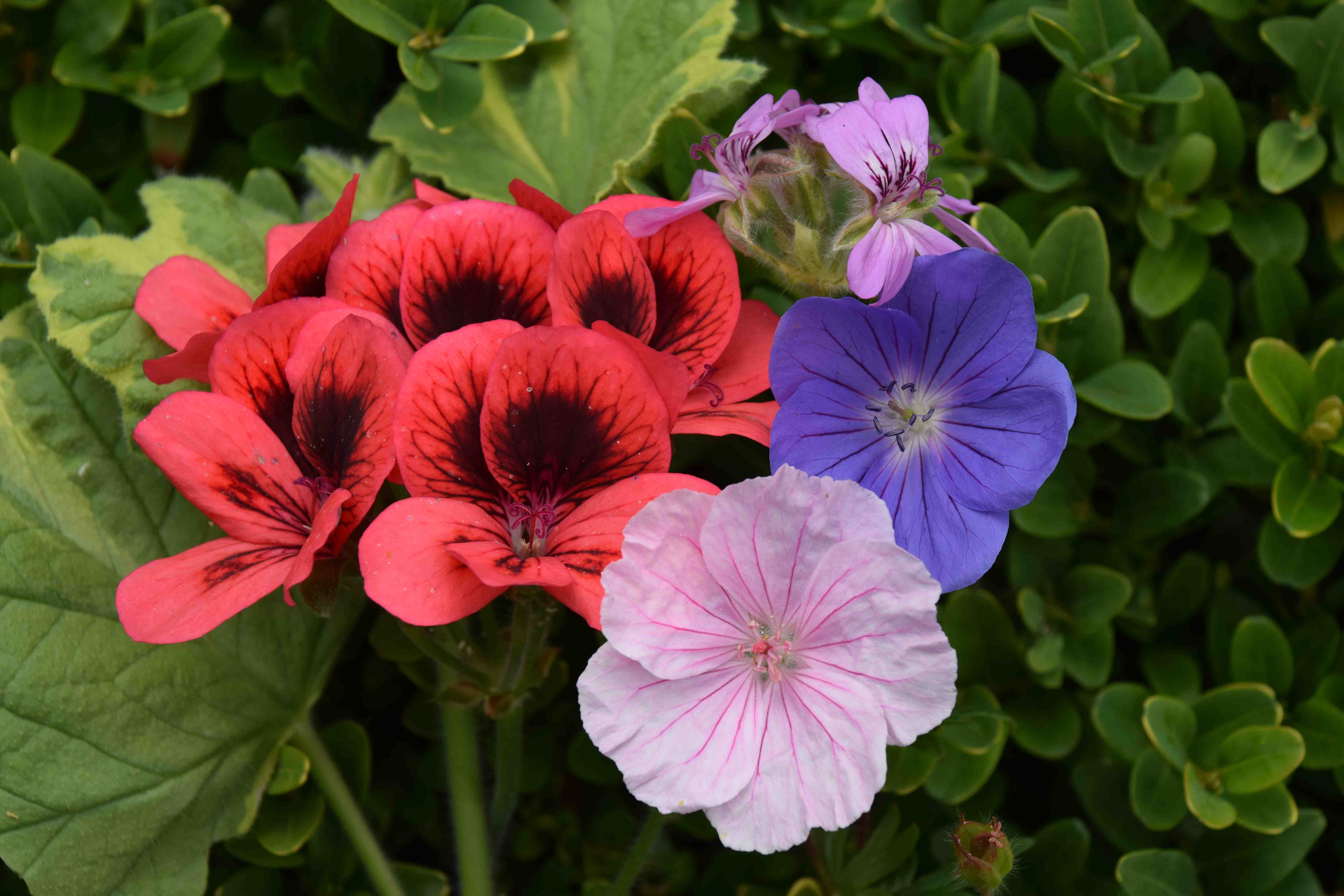 In contrast, geraniums have flowers that are actinomorphic, meaning that the flowers have many planes of symmetry. They can be divided into two identical parts with ten lines. The petals are all the same. Most are herbaceous though some are woody at the base, and the flowers can be white, pink, purple or blue but NEVER true red.