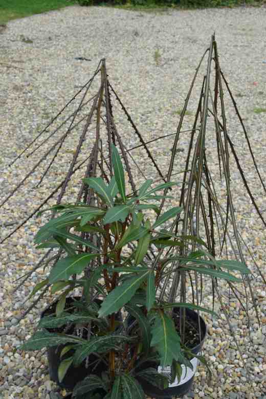 I bought three pseudopanax. These shrubby plants from New Zealand are quite odd and P. ferox (Left) and P. crassifolius (right) have distinct juvenile foliage that is tough, spiny and narrow. Only when mature do plants develop foliage like the plant in the foreground. It is thought this was an evolutionary development to prevent browsing by the now extinct Moas – giant flightless birds. Ironically, the plant in the foreground is ‘Moa’s Toes’, named after the shape of the leaves which are the same shape as … I think you get the idea. These pseudopanax need good light and perfect drainage. They are borderline hardy, best in a sheltered spot, but ideal for coastal gardens. These will stay in the polytunnel until I get the perfect spot and the soil well conditioned for them.
