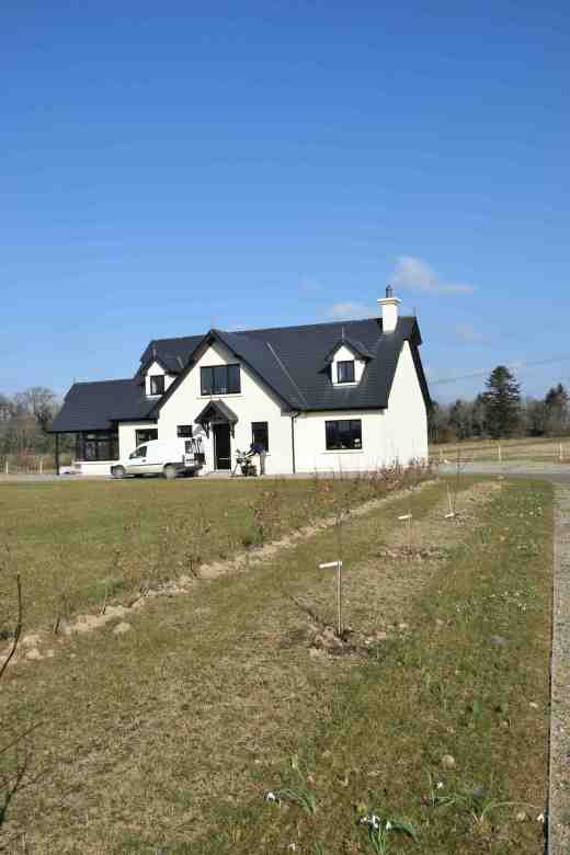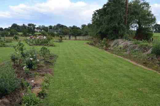 Looking the other way, north, I will keep the long walk. The rose hedge on the left is the only one that has established well and survived the grazing sheep. Not so much fun to trim though. In the middle distance is a mound of soil from the excavation of the three ponds – still to be lined.