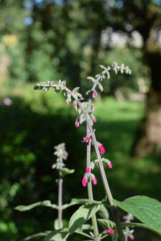 The most extraordinary, and you can probably guess, with the smallest flowers, are carried by Salvia bullulata ‘pale form’. The deeply embossed leaves are carried on rather awkwardly branched and spreading stems, so far at least, and terminate in stiff spires of small blue flowers. To call them blue is to do them a disservice; they are a pale icy blue touched with green that makes them almost turquoise. In a genus where the production of true blue is taken for granted this colour is dreamy.