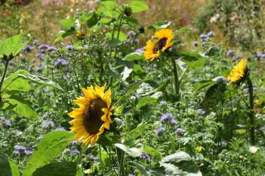I sowed mixed annuals for the bees but phacelia dominated the mix, apart from the sunflowers I planted. Fortunately phacelia is loved by bees and is one of the few plants that seems to attract both honeybees and bumble bees – honeybees seem much more picky. Curiously the honeybees seem to visit to collect pollen while the bumble bees search for nectar.