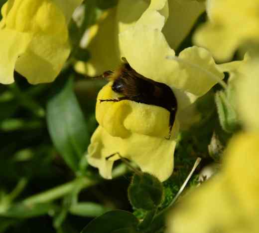 Antirrhinums are definitely bumble bee flowers. Honeybees cannot get in to the blooms to get to the nectar and even the smaller species of bumble bees have trouble. But the big bees have no trouble, forcing the flowers open and climbing in so that only their furry bottom is exposed. The bees often clamber from bloom to bloom up the stems.