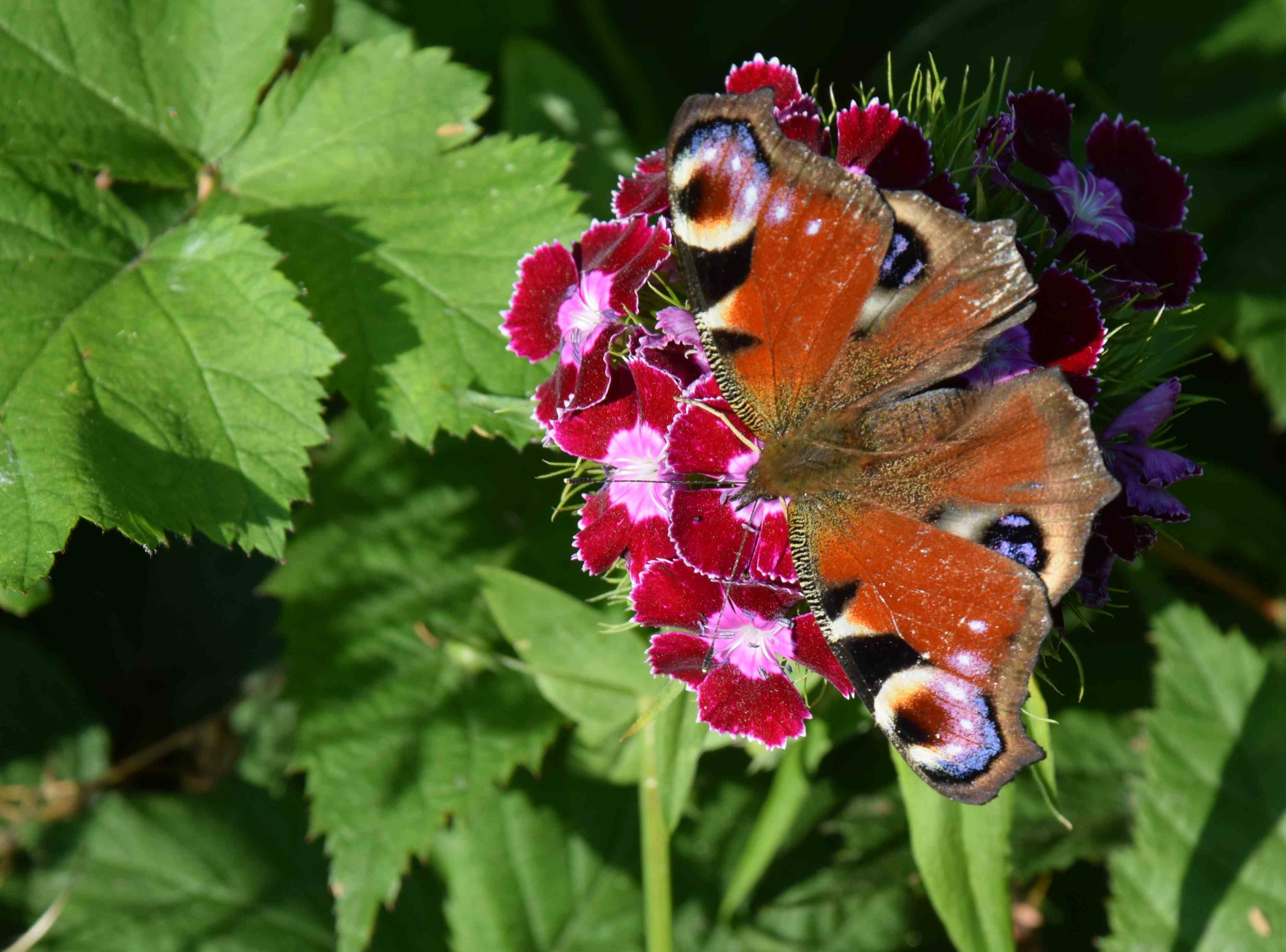 Although today was windy and not great for watching bees and butterflies, earlier in the week the sunshine brought them out. The annual sweet Williams are particularly popular with butterflies such as this peacock (Inachis io).