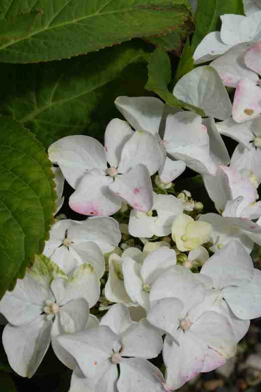 I mentioned that white hydrangeas won’t go pink or blue but in fact the tiny fertile flowers and the actual flowers in the centre of those large bracts WILL change to pale pink or pale blue according to availability of magnesium – just that they are so small that we don’t usually bother to mention them.