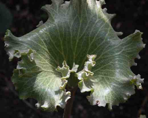 But the apple of my eye (today) is ‘Crispatum’ which is weird and wonderful. The leaves are up to 20cm across, wavy and curled at the edges and covered in greyish hairs that lend a subtle colour to the leaves which also have a pink tinge when young. It grows best in a sheltered site in part shade with plenty of water but not wet in winter and it is superb in a pot (of John Innes compost). Alternatively combine it with hostas and ferns or some bergenias that would make up for its less than lovely appearance after a hard winter.